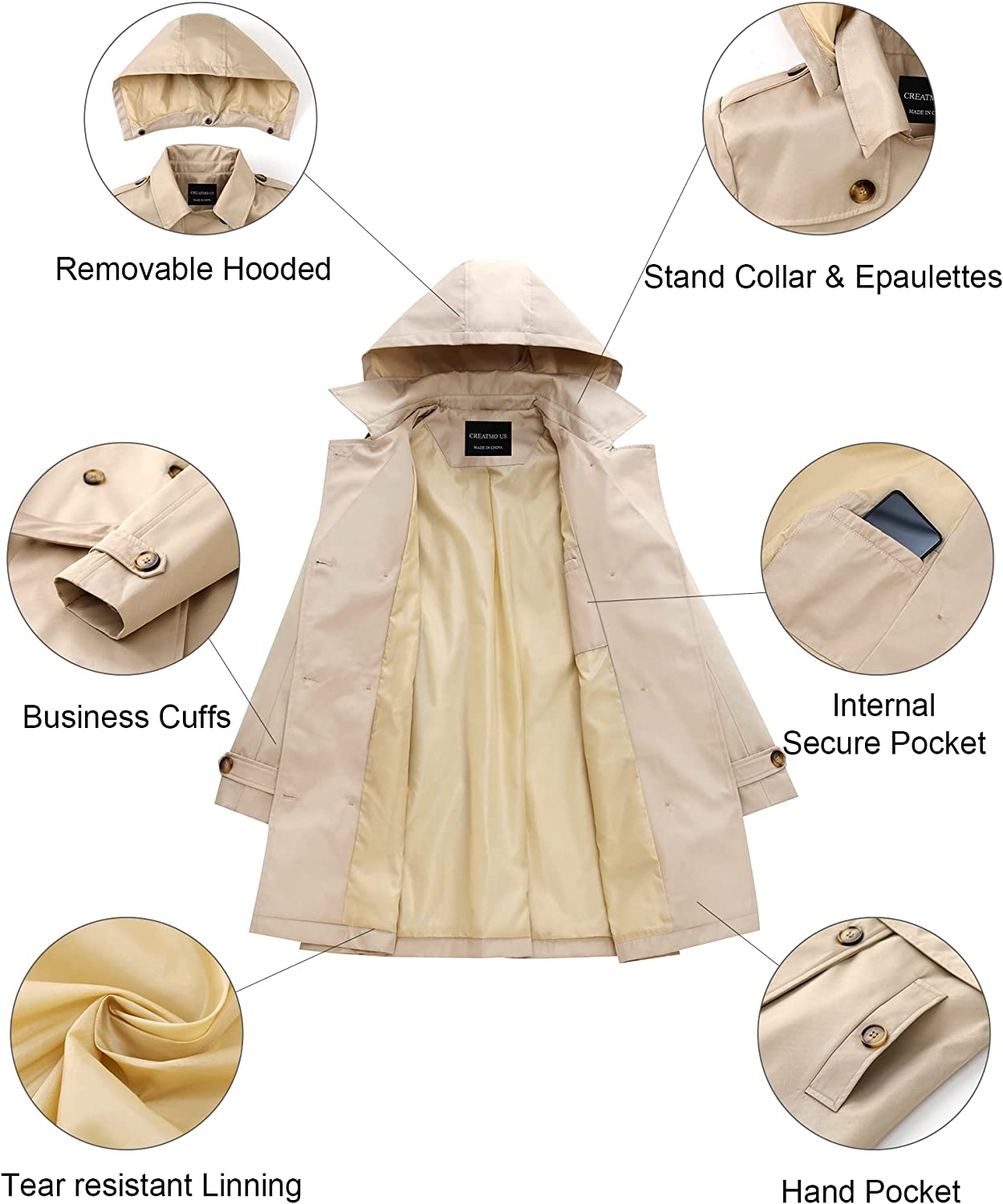 CREATMO US Women's Trench Coat Double-Breasted Classic Lapel Overcoat Belted Slim Outerwear Coat with Detachable Hood