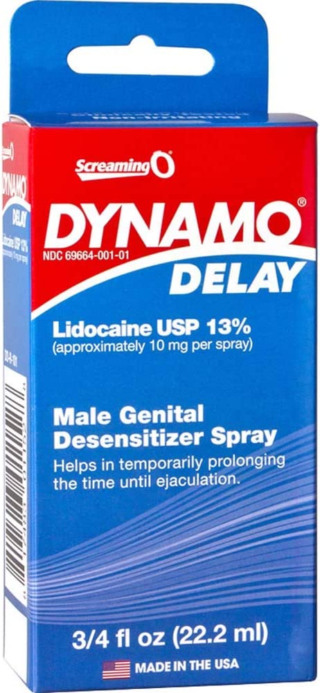 Dynamo Delay helps couples enjoy longer-lasting sex with a clinically tested fast-acting formula that provides safe and effective results. This non-irritating spray temporarily prolongs the time until ejaculation using a concentrated 13% lidocaine formula, which provides a topical numbing sensation that works in minutes and lasts for hours! Improve stamina, increase endurance, and prolong pleasure without a prescription! Features:* maximum strength Lidocaine. * Lidocaine USP 13% approximately 10 mg per spray. * Fast acting formula. * Safe and effective. * Clinically tested. Non-irritating. * Registered with the Food and Drug Administration NDC 69664-001-01. * Made in the USA. Uses:* for temporary male genital desensitization, helping to slow the onset of ejaculation. * Male Genital Desensitizer Spray helps in temporarily prolonging the time until ejaculation. * For reducing oversensitivity in the male in advance of intercourse. Directions: apply 3 or more sprays, not to exceed 10, to head and shaft of penis before intercourse, or use as directed by a doctor. Wash product off after intercourse.