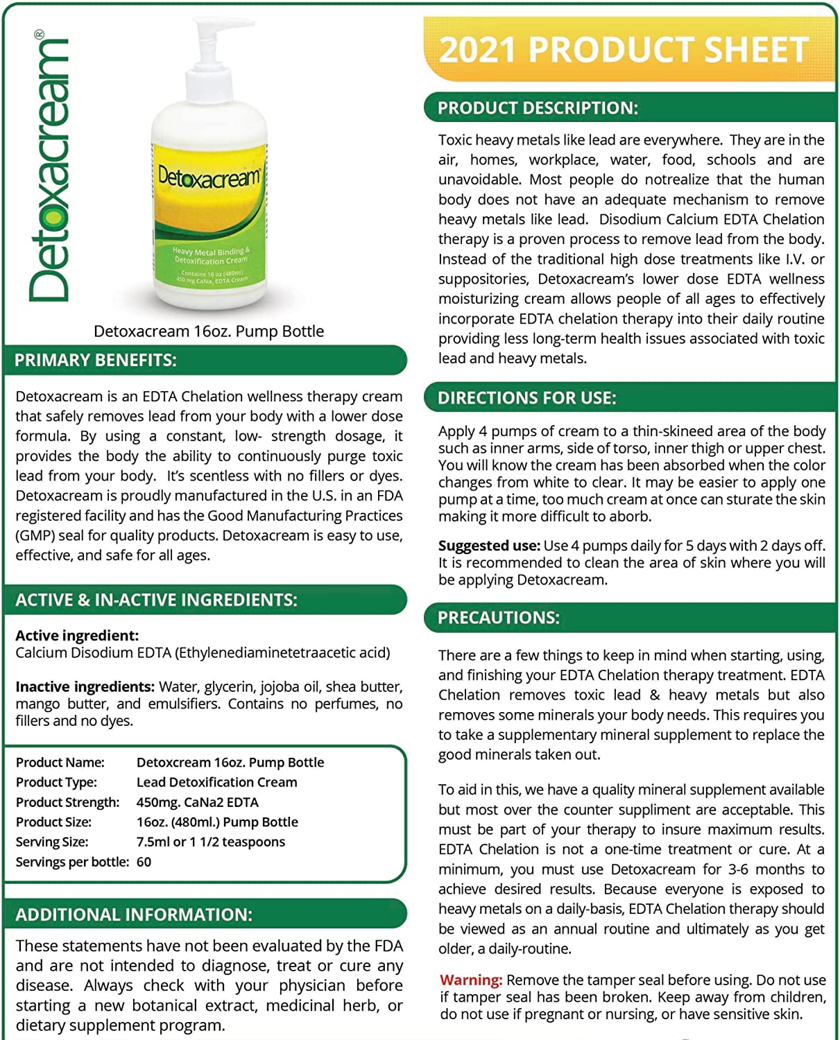 There are a few things to keep in mind when starting, using, and finishing your EDTA Chelation therapy treatment. EDTA Chelation is not a one-time treatment or cure. At a minimum, you must use Detoxacream for 3-6 months to achieve desired results. Not suitable for pregnant or lactating women unless directed by a physician. Not intended for use by persons under the age of 18 without supervision Always consult your physician before taking Food Supplements, especially if you are taking medication, have an existing medical condition or are due to undergo surgery. Side-effects are rare but please discontinue and contact your physician immediately in the event of an adverse reaction. INGREDIENTS – Calcium Disodium EDTA, water, glycerin, jojoba oil, shea butter, mango butter and emulsifiers. Contains no perfumes, fillers or dyes. HOW TO APPLY – You will want to apply the cream to a thin-skinned area of your body which has minimal fat. Most people use their forearms, shoulders, upper chest, neck, side of torso, inner thigh, top of feet and the back of the knee. By applying on a thin-skinned area, you ensure the most effective absorption of the Detoxacream. DOSAGE & USE – It is recommended and safe to use Detoxacream once nightly for a good initial detoxification. Depending upon your level of exposure or toxicity, you may need to use a higher dosage for up to 180 days or more. Using Detoxacream on a less frequent basis will not cause any problems but it may take longer to achieve the desired results. It can also be used multiple times a day without any issues. Detoxacream. It is recommended to use at night before bedtime but you can use it at any time.