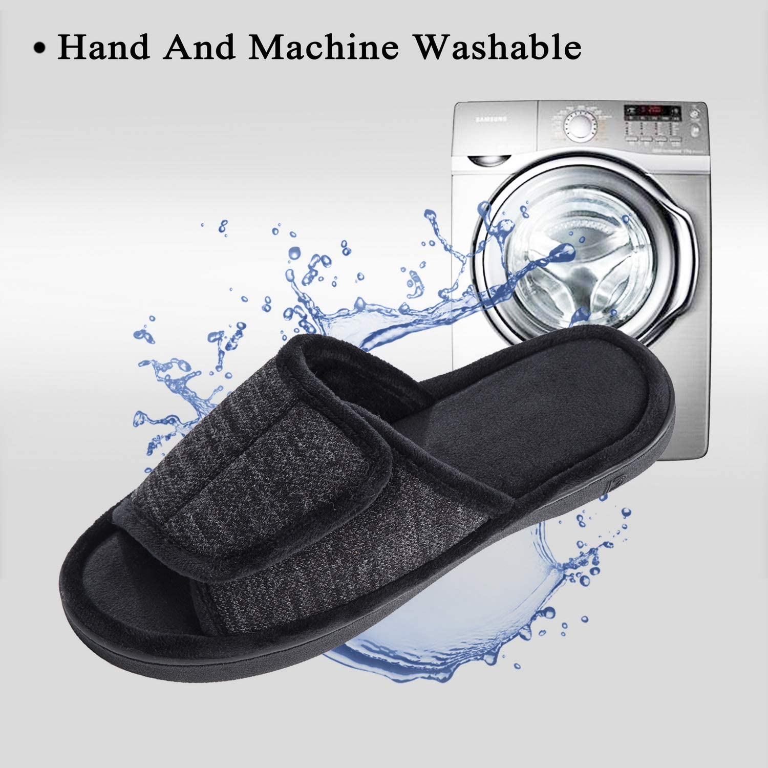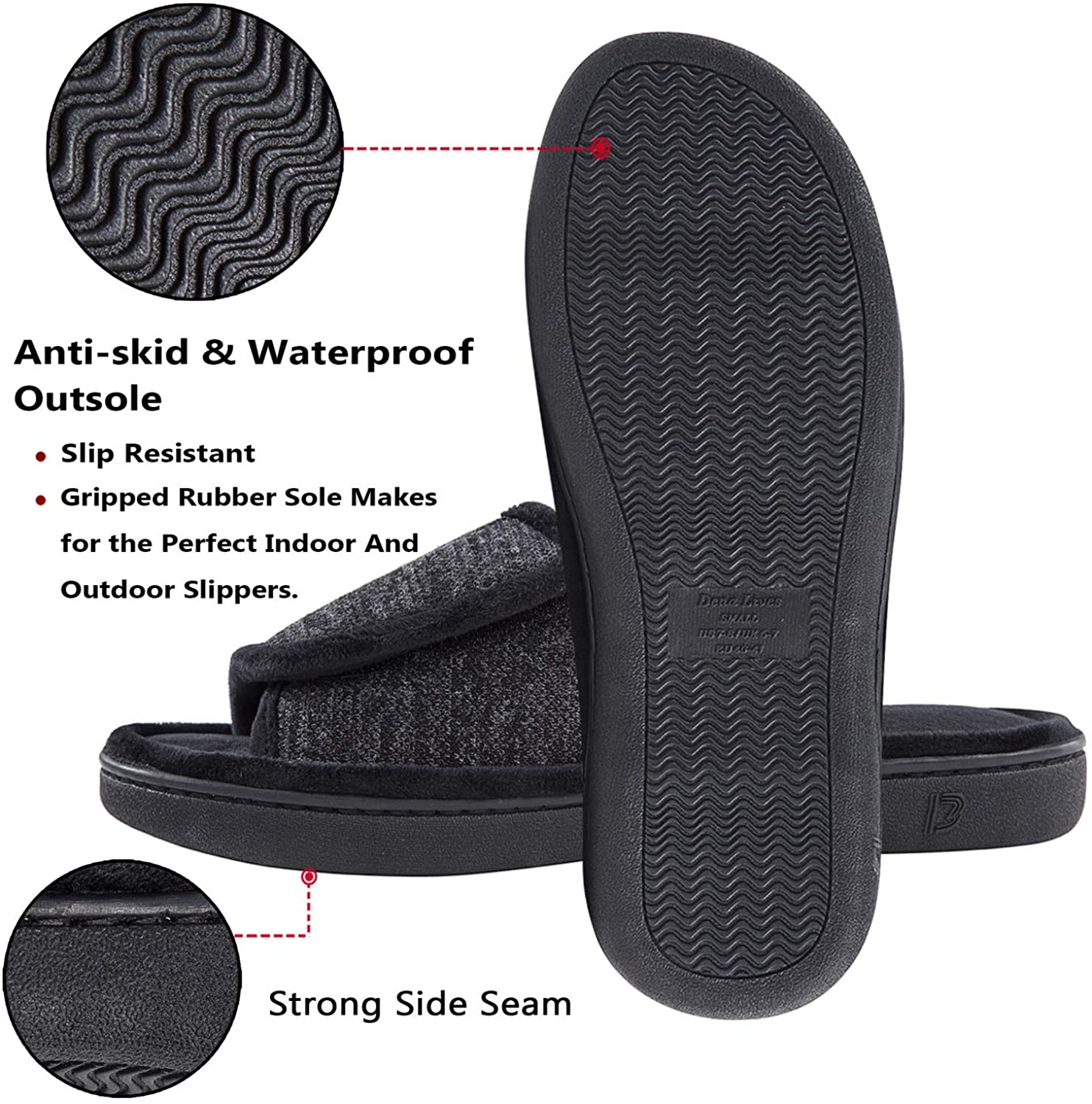 DL Adjustable Mens Slippers Memory Foam, Open Toe House Slippers for Men Comfy Indoor Outdoor, Cozy Breathable Slide Bedroom Velcor Slippers Size 7-14 Black Gray Navy Brown