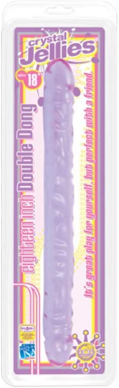Get ready for a double dose of fun. Doc Johnson's Crystal Jellies18 Inch Double Dong has beautifully shaped realistic heads and a heavily veined shaft for exciting sensations. It's true total lenght is 17.8 inches with a width of 1.8 inches (5.6 inches in girth). The substantial width and heavily textured shaft make this toy perfect for those that want a satisfying fullness deep inside. The shaft is flexible enough to allow for it to be bent for traditional DP or DPV/DPA. While the shaft is flexible enough to be bent in half, it's also firm enough to use for ass-to-ass or pussy-to-pussy partnered play. The Crystal Jellies Double Dong is made of body-safe, latex-free, non-phthalate PVC and it's Proudly Made In America. We think that being Made In America is a big deal and you should too. After all, you are planning on inserting this into your body or the body of your loved one(s)