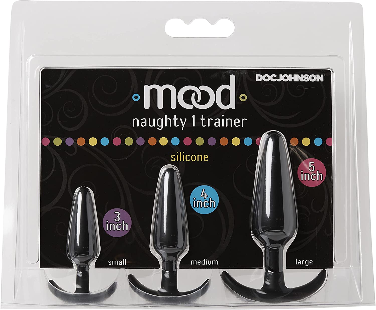 How naughty do you want it? The Mood Naughty 1 Trainer Set in premium silicone includes our bestselling original Mood Naughty butt plug in three graduated sizes. Measuring at 3, 4, and 5 inches, this set is perfectly shaped and sized to help backdoor beginners gently expand the boundaries of their anal experience. The classic tapered tip of Mood Naughty slides right in, and the firm yet flexible material and curved rocker base make these plugs comfortable and safe for extended wear.