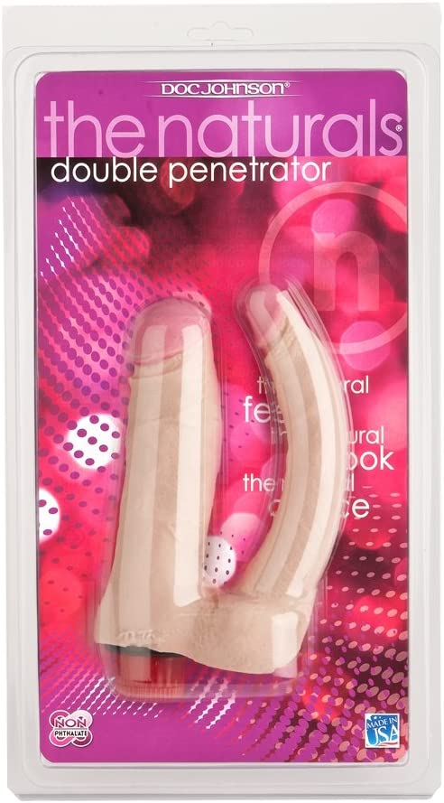 This Vibrating Double Penetrator offers dual vaginal & anal play, made from rubber with a realistic feel! The vaginal dong measures 5 inches in length, and has a 5 inch girth. The anal dong measures 5 inches in length, and has a 3.5 inch circumference. This 'Naturals' dong has realistic style and thick veined for additional pleasure, with a twist bottom to power it on!