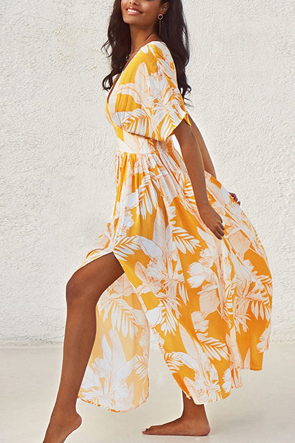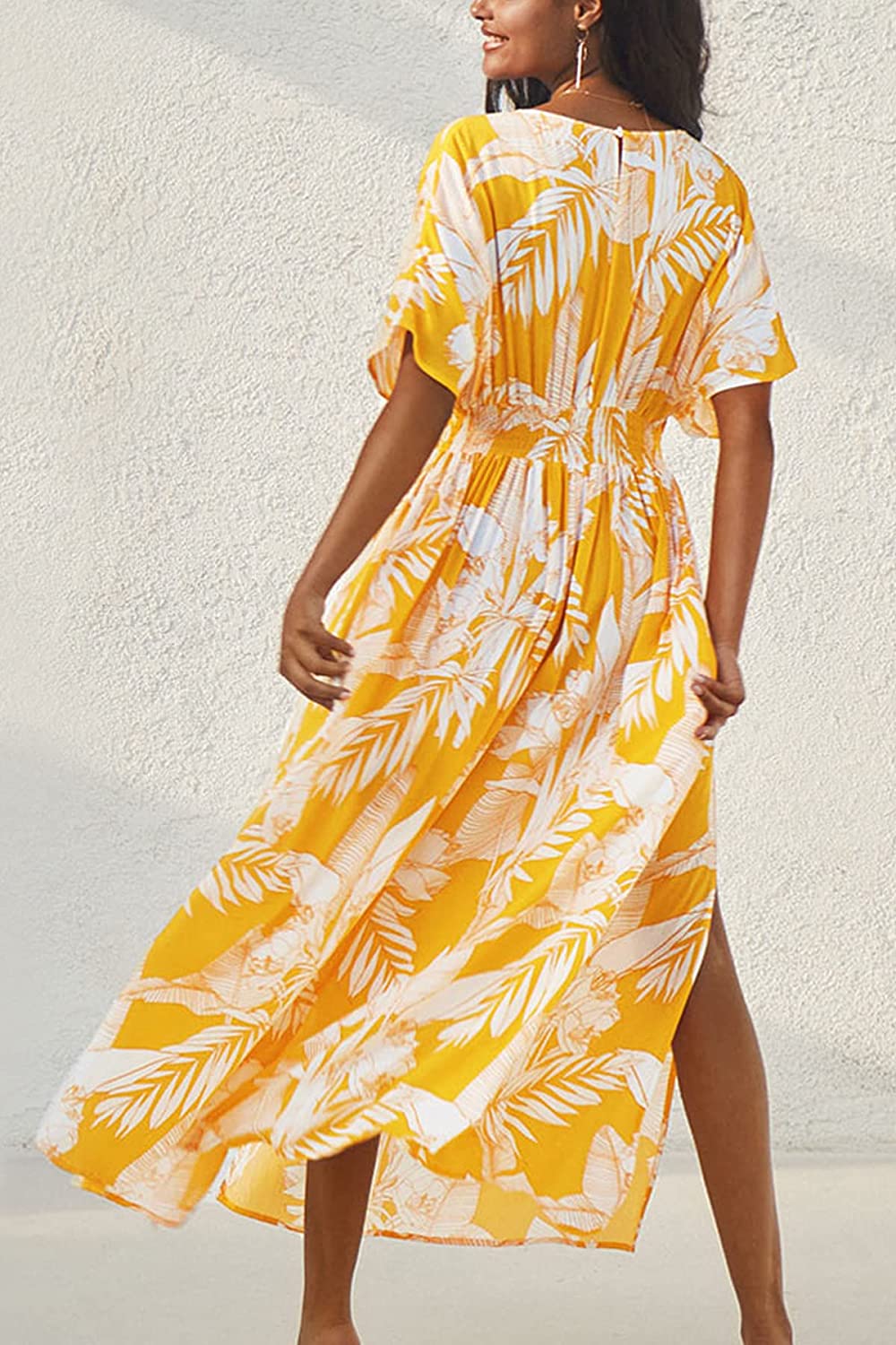 Dress for Women Summer Midi Dress V Neck Button Elastic Waist Cut Out Back 3/4 Sleeves Floral Printed