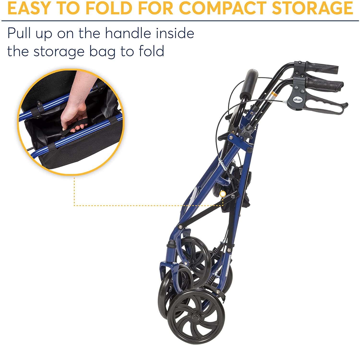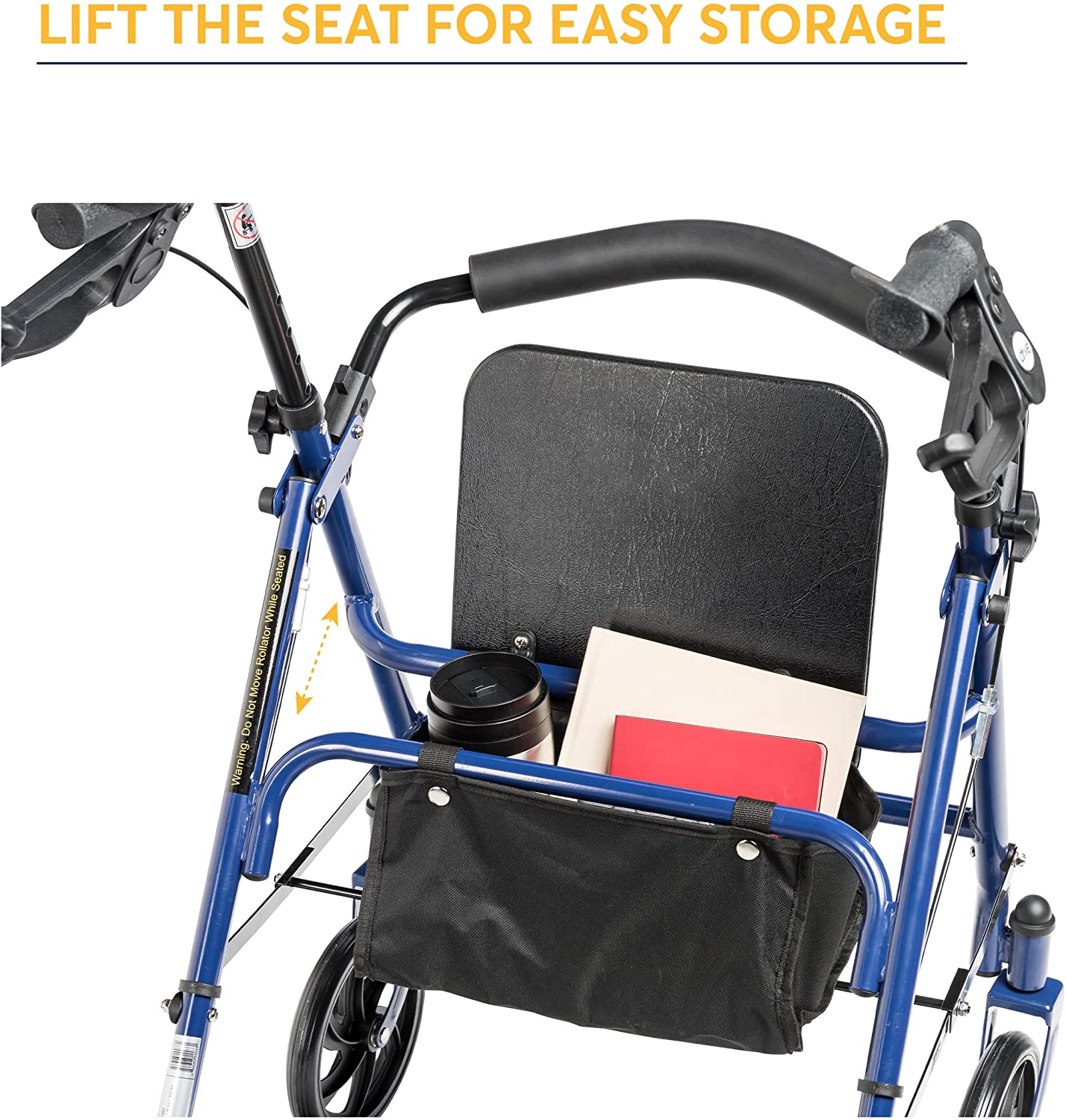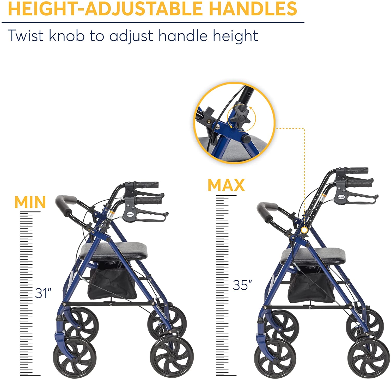 Drive Medical's portable rollator walker with seat continues to lead the charge when it comes to design, quality, and value. With a strong and steady steel frame, this 4-wheeled adult walker offers strength, support, durability, and comfort. The walker with seat and wheels comes complete with a hinged padded backrest, which can be removed by folding it up or down. The indoor and outdoor walker also boasts comfortable 12-inch square seat, a convenient pouch for personal items, and 7.5-inch wheel casters. The height-adjustable rollator's handles can moved up or down according to your height and are ergonomic to reduce undue stress on hands and joints. With the 4-wheel rollator walker as your travel companion, there is no need to overextend yourself because this standing walker doubles as a comfortable chair, allowing you to rest and refresh yourself anywhere and at any time. Backed by a limited lifetime warranty from Drive Medical, a leading brand of mobility aids and other medical goods for more than 20 years, you can purchase with confidence.