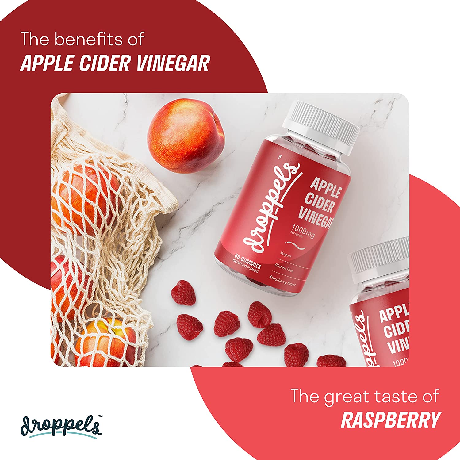 Droppels Apple Cider Vinegar Gummies 1000mg with Beet Root & Pomegranate - Supports Digestion - Vegan, Gluten Free, Made in USA - Rasberry Apple Flavor - 60 Count