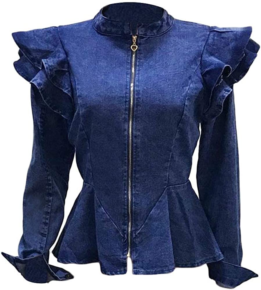 ECHOINE Women Casual Denim Jacket - Long Sleeve Zip Ruffle Shoulder Jean Jackets Peplum Coat Plus Size