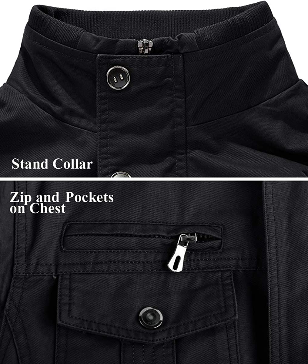 EKLENTSON Men's Cotton Lightweight Multi Pockets Zip Front Stand Collar Military Jackets Windbreaker
