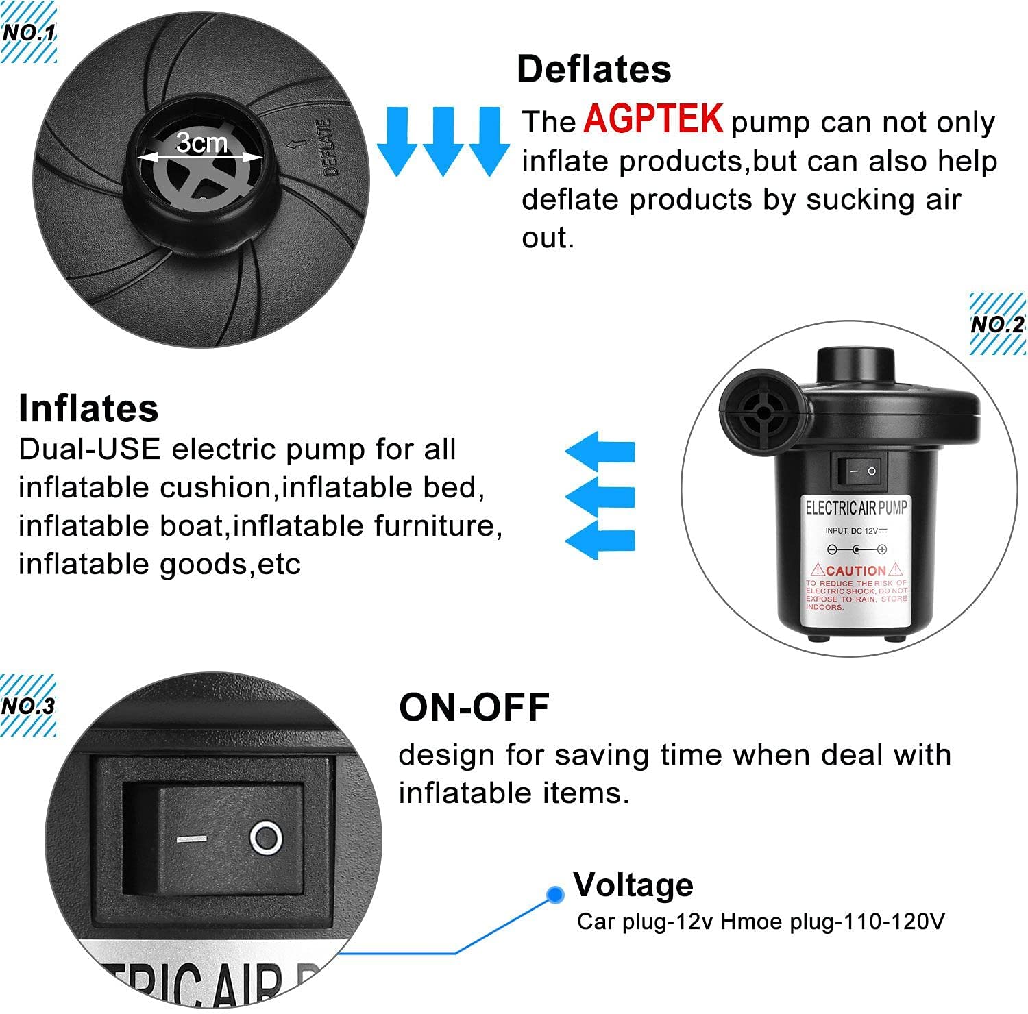 Electric Air Pump, AGPtEK Portable Quick-Fill Air Pump with 3 Nozzles, 110V AC/12V DC, Perfect Inflator/Deflator Pumps for Outdoor Camping, Inflatable Cushions, Air Mattress Beds, Boats, Swimming Ring