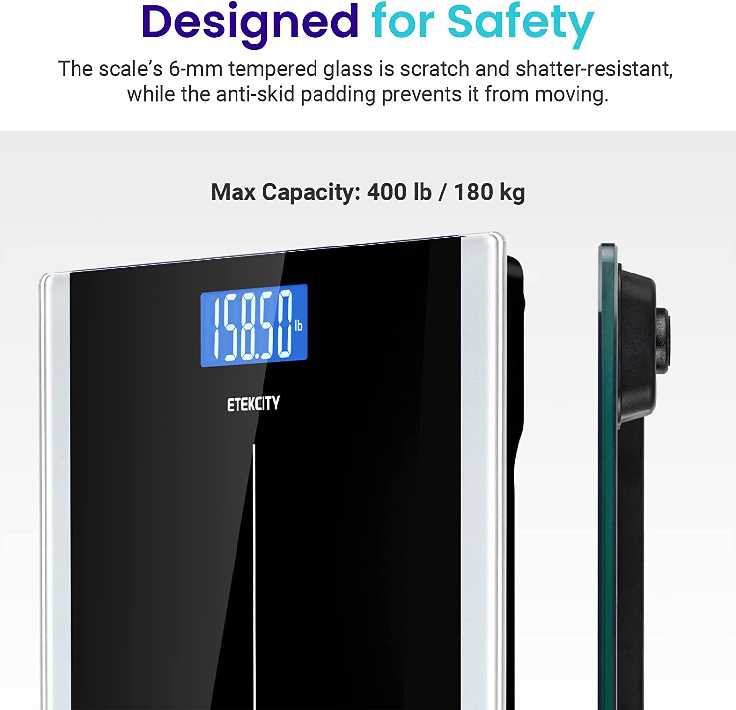 Staying fit and healthy is just a step away. Simply stepping on the large tempered glass platform and receive immediate results displayed on a sizeable backlit LCD display. Sophisticated sensors ensure that your results are within 0.1 lbs. Of whatever is being weighed, ensuring accurate weight measurement time after time. Specification weight capacity: 180 kg (400 lbs) Graduation: 0.1lb / 0.05kg units: kg/ lbs platform: 6mm tempered glass auto-multifunction: low battery overload indication; auto on or off or zero LCD display: 3.1" Note: 1. Scale is placed on a hard, flat surface (tile, wood, etc.). If it is placed on something soft (such as carpet), it will not weigh accurately. 2. Keep your gravity in the center of the scale and your body stable while taking measurements. 3. Clear the scale: step on the scale until the display lights up, then step off until the scale shows "0.0." Do this each time you are measuring your weight. 4. Try weighing first thing in the morning (after using the restroom) and with minimal clothing to prevent deviation or skewed readings. 5. This scale was designed for measuring weights of at least 11 lb. For lighter objects, we suggest an Etekcity kitchen scale. 6.Package Information: 1 x Etekcity Body weight scale, 1 x QSG, 2x 1.5V AAA batteries.