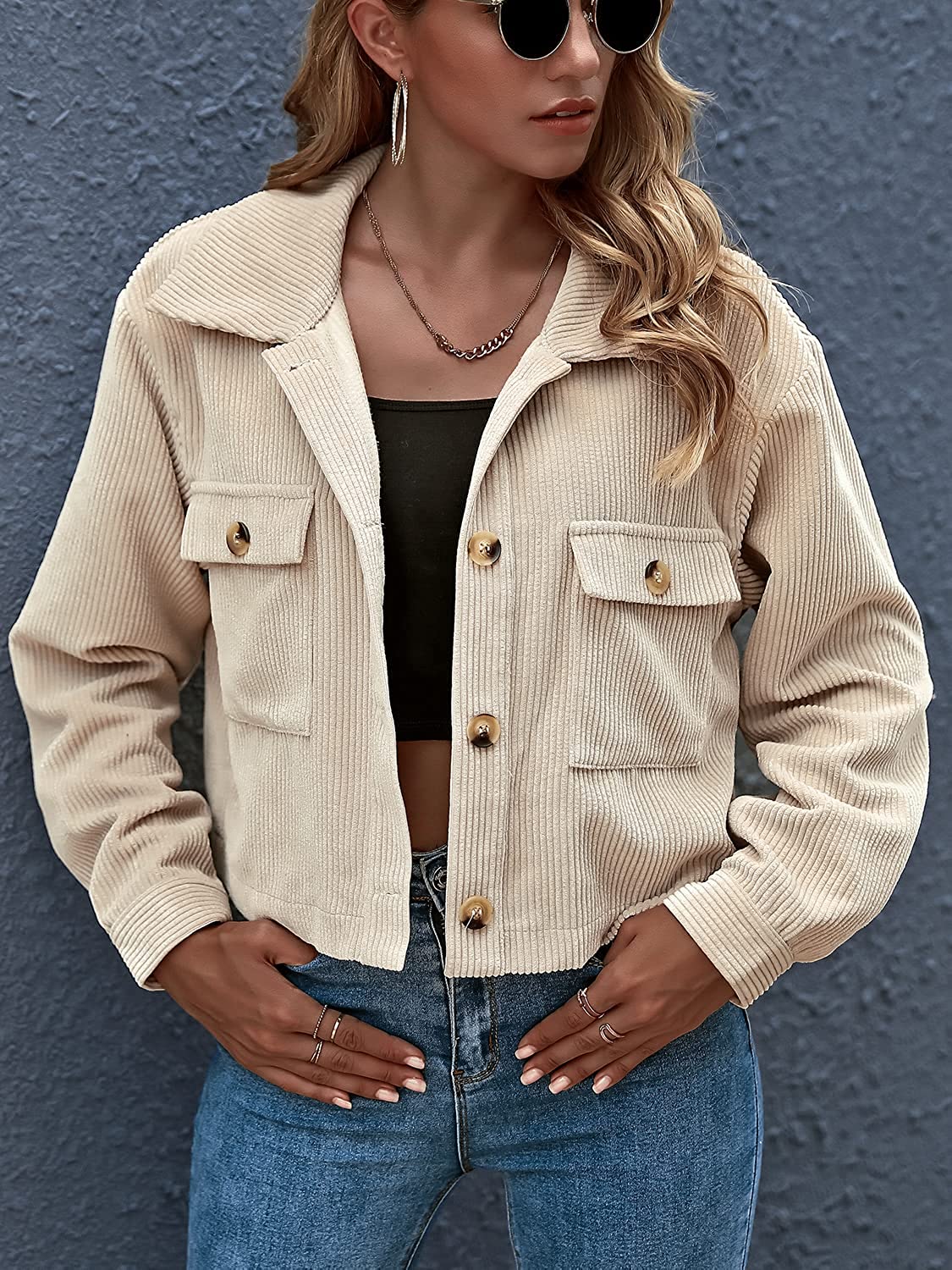 Eteviolet Women's Casual Cropped Corduroy Jackets Button Down Long Sleeve Shirts Jacket With Pockets