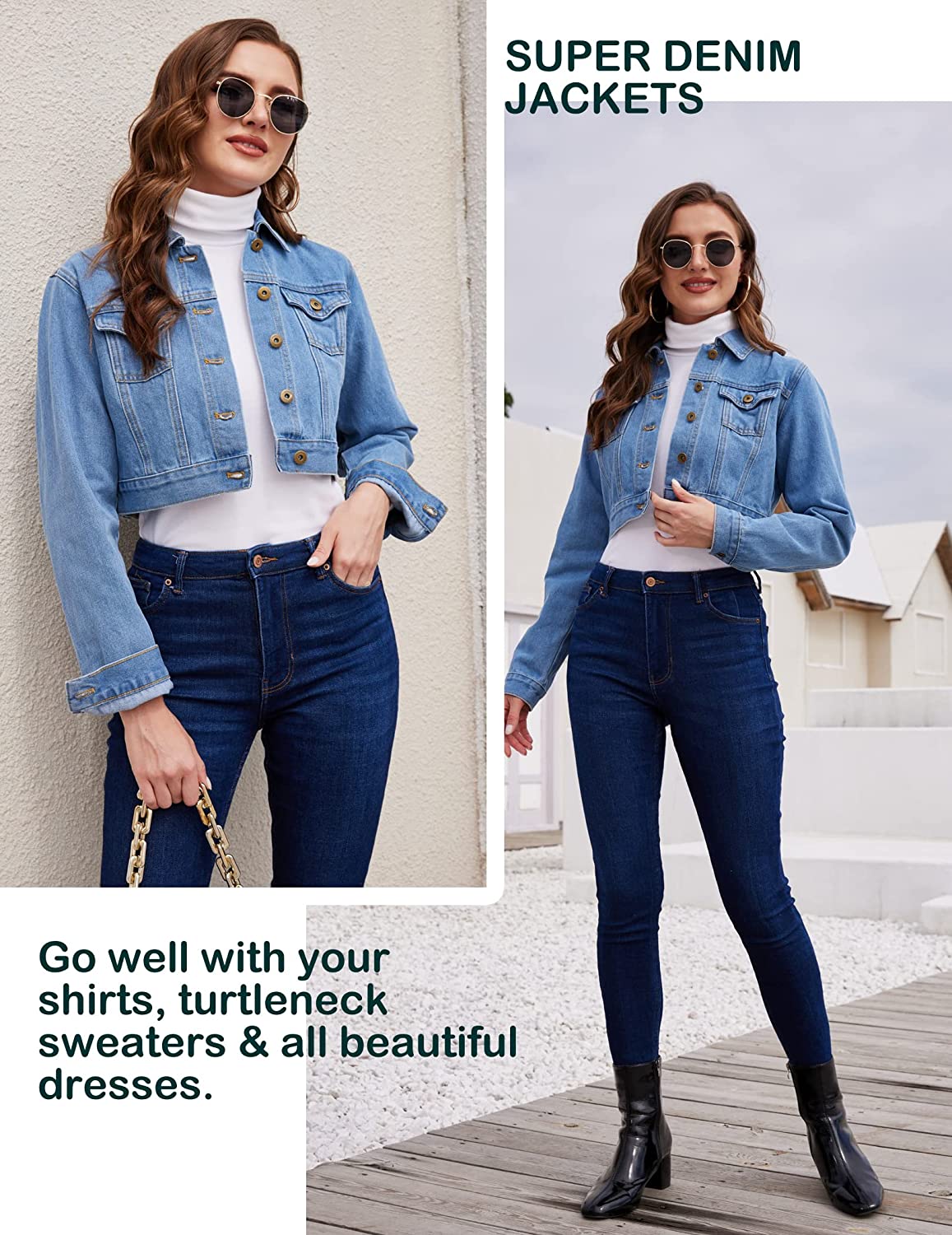 Grabsa Women's Button Down Long Sleeve Cropped Denim Jean Jacket with Pockets