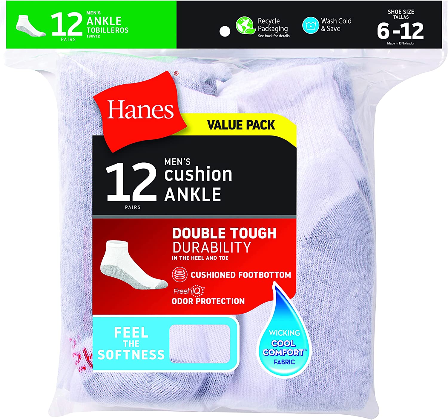 Hanes Double Tough B&T 12-Pack Ankle socks pack a powerful punch with double tough durability and maximum cushioning around the foot for ultimate comfort. Wicking Cool Comfort® Fabric will help keep your feet cool and dry. Our FreshIQ® Advanced Odor Protection will help fight those stinky feet! Spandex and Comfort Toe Seam will provide comfort and a better fit. Fits Men's shoe size 12-14.