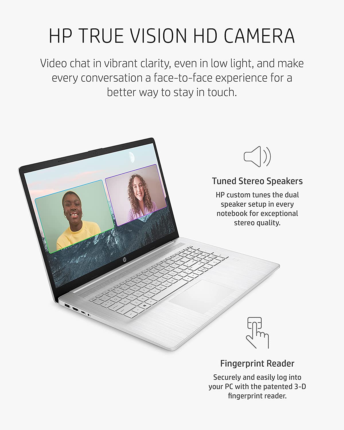 Thoughtfully crafted, the HP 17 Laptop PC blends sustainability with performance and comfort. Computing has never been more satisfying or comfortable with the lift-hinge design and enlarged click pad. It's not just the keyboard that’s comfortable but the display too; the 178 degree wide-viewing angles and the anti-glare screen make every visual experience a memorable one on a FHD IPS display (1). Enjoy reliable performance and incredible graphics thanks to the perfect combination of the 11th Generation Intel® Core™ i5-1135G7 processor and Intel® Iris® Xe Graphics (2) (3). Get all the storage you need and the high bandwidth you crave courtesy of your laptop computer’s 512 GB of Solid-State Drive storage and 8 GB of RAM (4) (5). Beyond the hardware, this HP laptop has many more features to take your work and play to new levels of comfort. Don’t stress about battery life again with up to 8 hours and 15 minutes to play with (6), plus the added benefit of HP Fast Charge technology for quicker recharges when you need it (7). Get right to work with the Windows 10 operating system you know and love and enjoy a greater peace of mind thanks to the HP 1-year limited hardware warranty (8). Your internet is smooth, stable, and supports an ultra-fast gigabit data rate with a Wi-Fi 6 (1x2) and Bluetooth® 5.2 combo (9) (10). Keep up the productivity, even while you work from anywhere. This Windows laptop has everything you need for expert video calls from the HP TrueVision HD camera to the custom-tuned dual speaker setup (11). Additional integrated features like the fingerprint reader and the backlit keyboard ensure your workspace is secure and comfortable, wherever or whenever you work (12). Do your part toward a sustainable future with an environmentally responsible laptop. Eco-conscious materials like ocean-bound plastic are used in the construction of the cover, bezel, and speaker enclosure (13). The outer boxes and fiber cushions used in the packaging are 100% sustainably sourced and recyclable (14). The HP 17.3 laptop is also ENERGY STAR® certified and EPEAT® Silver registered (15) (16). (1) Full High Definition (FHD) content is required to view FHD images. (2) Multi-core is designed to improve the performance of certain software products. Not all customers or software applications will necessarily benefit from the use of this technology. Performance and clock frequency will vary depending on the application workload and your hardware and software configurations. Intel’s numbering, branding, and/or naming is not a measurement of higher performance. Intel, Pentium, Intel Core, Celeron, Iris Xe, Intel logo, and the Intel Inside logo are trademarks of Intel Corporation in the U.S. and other countries. (3) Shared video memory (UMA) uses part of the total system memory for video performance. System memory dedicated to video performance is not available for other use by other programs. (4) Actual formatted capacity is less. A portion of internal storage is reserved for preloaded content. (5) Based on HP internal testing using CrystalDiskMark benchmarking software. Performance is sequentially faster (read-only) compared to traditional 5,400 rpm HDD. (6) Windows 10 MobileMark 18 battery life will vary depending on various factors including product model, configuration, loaded applications, features, use, wireless functionality, and power management settings. The maximum capacity of the battery will naturally decrease with time and usage. See bapco.com/products/mobilemark-2018/ for additional details. (7) Recharges your battery up to 50% within 45 minutes when the system is off (using the “shutdown” command). Recommended for use with the HP adapter provided with the notebook, not recommended with a smaller capacity battery charger. After charging has reached 50% capacity, charging speed will return to normal speed. Charging time may vary +/-10% due to System tolerance. (8) Not all features are available in all editions or versions of Windows. Systems may require upgraded and/or separately purchased hardware, drivers, software, or BIOS update to take full advantage of Windows functionality. Windows 10 is automatically updated, which is always enabled. ISP fees may apply and additional requirements may apply over time for updates. See microsoft.com (9) Wireless access point and internet service required and sold separately. Availability of public wireless access points limited. Requires a wireless router, sold separately, that supports 80MHz channels. Wi-Fi 6 (802.11ax) is backwards compatible with prior 802.11 specs. The specifications for Wi-Fi 6 are draft and are not final. If the final specifications differ from the draft specifications, it may affect the ability of the notebook to communicate with other Wi-Fi 6 devices. Only available in countries where 802.11ax is supported. Based on Wi-Fi 5 80MHz and Wi-Fi 6 160MHz minimum requirements when transferring files between two devices connected to the same router. Requires a wireless router, sold separately, that supports 802.11ax (Wi-Fi 6). Only available in countries where 802.11ax is supported. (10) Bluetooth® is a trademark owned by its proprietor and used by Hewlett-Packard Company under license. (11) Features may require software or other 3rd party applications to provide the described functionality. Internet service required and not included. (12) Wireless access point and internet service required and sold separately. Availability of public wireless access points limited. (13) Percentage of ocean-bound plastic contained in each component varies by product. (14) 100% outer box/corrugated cushion packaging made from sustainably sourced certified and recycled fibers. Fiber cushions are made from 100% recycled wood fiber and organic material. Excludes plastic bags and plastic foam sheeting. (15) ENERGY STAR and the ENERGY STAR mark are registered trademarks owned by the U.S. Environmental Protection Agency. (16) Based on U.S. EPEAT