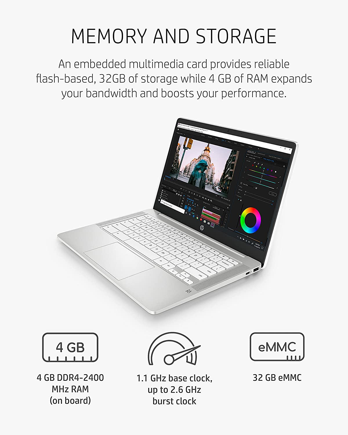 The HP Chromebook empowers you to work more efficiently from the comfort of your own home. The 14” HD (1366 x 768) micro-edge, anti-glare (1) display makes images appear crisp. With Intel® Celeron® N4000 (2) processing power and Intel® UHD Graphics 600 (3), binge watching, gaming, and music are taken to new heights. Securely storing and quickly accessing your work is a breeze with 32 GB eMMC storage (4) and 4 GB of RAM. Work and entertainment doesn’t have to end with up to 13 hours and 30 minutes of streaming power (5) with mixed usage. The Chrome operating system lets you effortlessly navigate through tabs and programs. Your Chromebook is protected with HP’s 1-year limited hardware warranty. Easily communicate with colleagues and friends with the HP Wide Vision HD camera (6) with integrated dual array digital microphones. The Wi-Fi® 5 (2x2) and Bluetooth® 5.0 combo (7) keeps your connection clear so you can continue to work with efficiency. This lightweight computer is 3.24lbs (8), allowing you to easily store it in your Chromebook case for on-the-go use. Reduce your carbon footprint by working with HP ENERGY STAR® certified (9) and EPEAT® Silver registered (10) computers. (1) High-definition (HD) content is required to view high definition images. (2) Multi-core is designed to improve performance of certain software products. Not all customers or software applications will necessarily benefit from use of this technology. Performance and clock frequency will vary depending on application workload and your hardware and software configurations. Intel’s numbering, branding and/or naming is not a measurement of higher performance. Intel, Pentium, Intel Core, Celeron, Iris Xe, Intel logo and the Intel Inside logo are trademarks of Intel Corporation in the U.S. and other countries. (3) Shared video memory (UMA) uses part of the total system memory for video performance. System memory dedicated to video performance is not available for other use by other programs. (4) For storage drives, GB = 1 billion bytes. Actual formatted capacity is less. Portion of internal system storage is reserved and not user accessible. (5) Testing conducted by HP using Google Chrome OS power LoadTest. Battery life will vary and the maximum capacity of the battery will naturally decrease with time and usage. See chromium.org/chromium-os/testing/power-testing for test details. (6) Features may require software or other 3rd party applications to provide the described functionality. Internet service required and not included. (7) Wireless access point and internet service required and sold separately. Availability of public wireless access points limited. Wi-Fi 5 (802.11ac) is backwards compatible with prior Wi-Fi 5 specs. Bluetooth® is a trademark owned by its proprietor and used by Hewlett-Packard Company under license. (8) Weight and system dimensions may fluctuate due to configuration and manufacturing variances. (9) ENERGY STAR and the ENERGY STAR mark are registered trademarks owned by the U.S. Environmental Protection Agency. (10) Based on U.S. EPEAT® registration according to IEEE 1680.1-2018 EPEAT®. EPEAT® status varies by country. Visit www.epeat.net for more information. High-definition (HD) content is required to view high definition images.