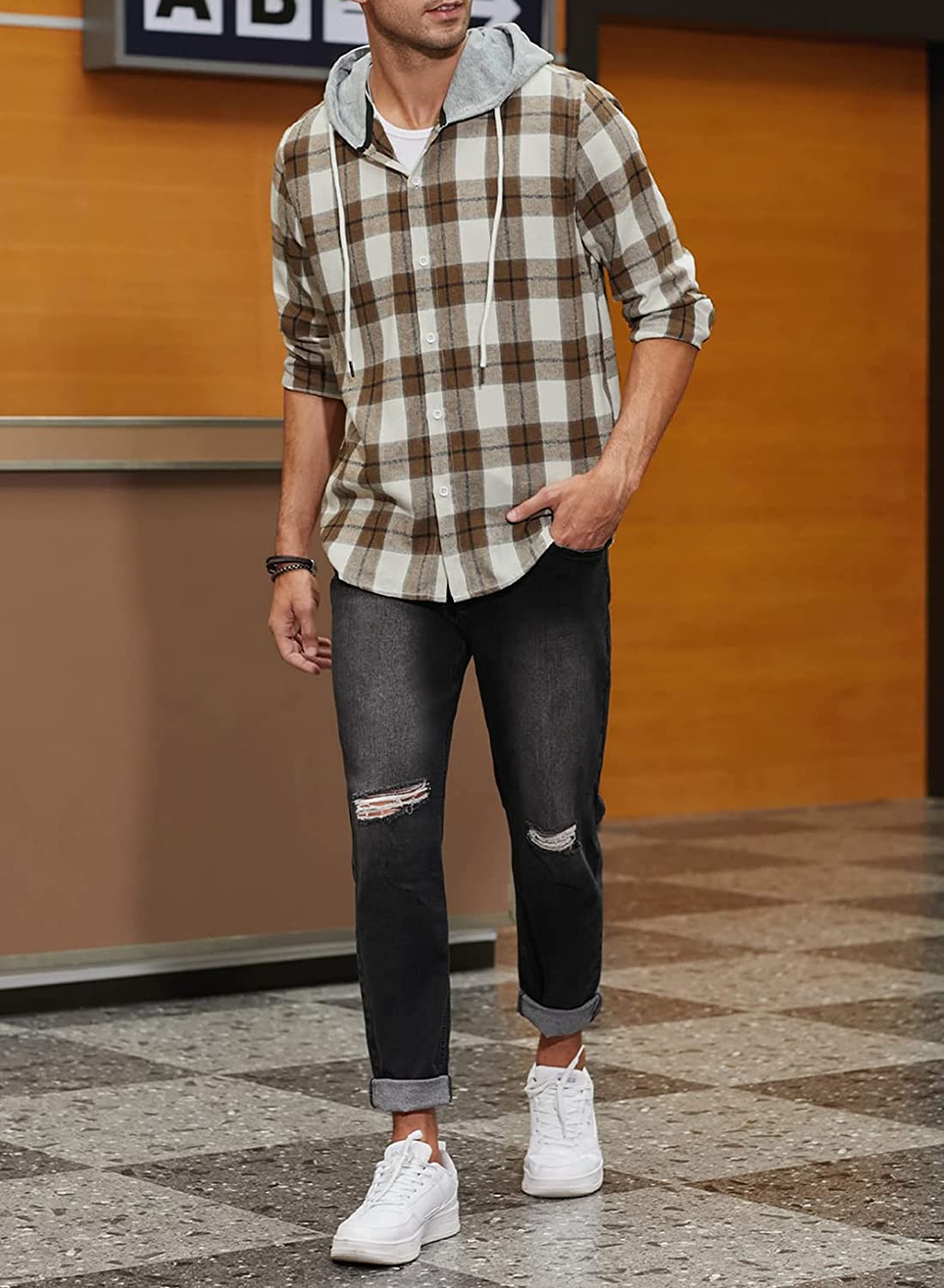 JMIERR Mens Flannel Plaid Hoodie Shirts Casual Button Down Long Sleeve Lightweight Shirt