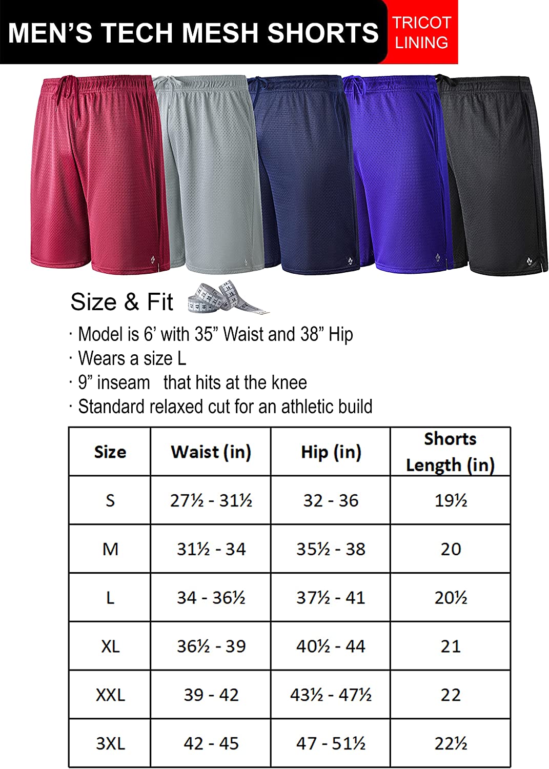 Liberty Pro 5-Pack Men's 9" Athletic Mesh Shorts with Pockets Tech Tricot Lining Quick Dry Performance Activewear