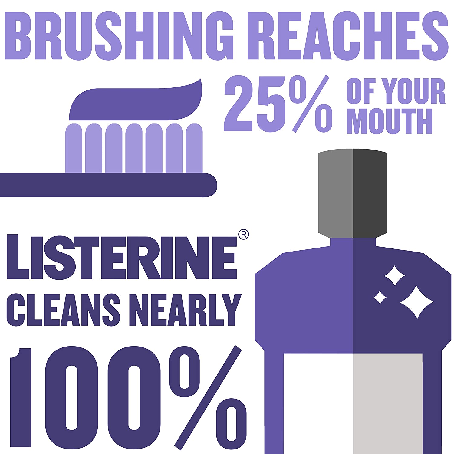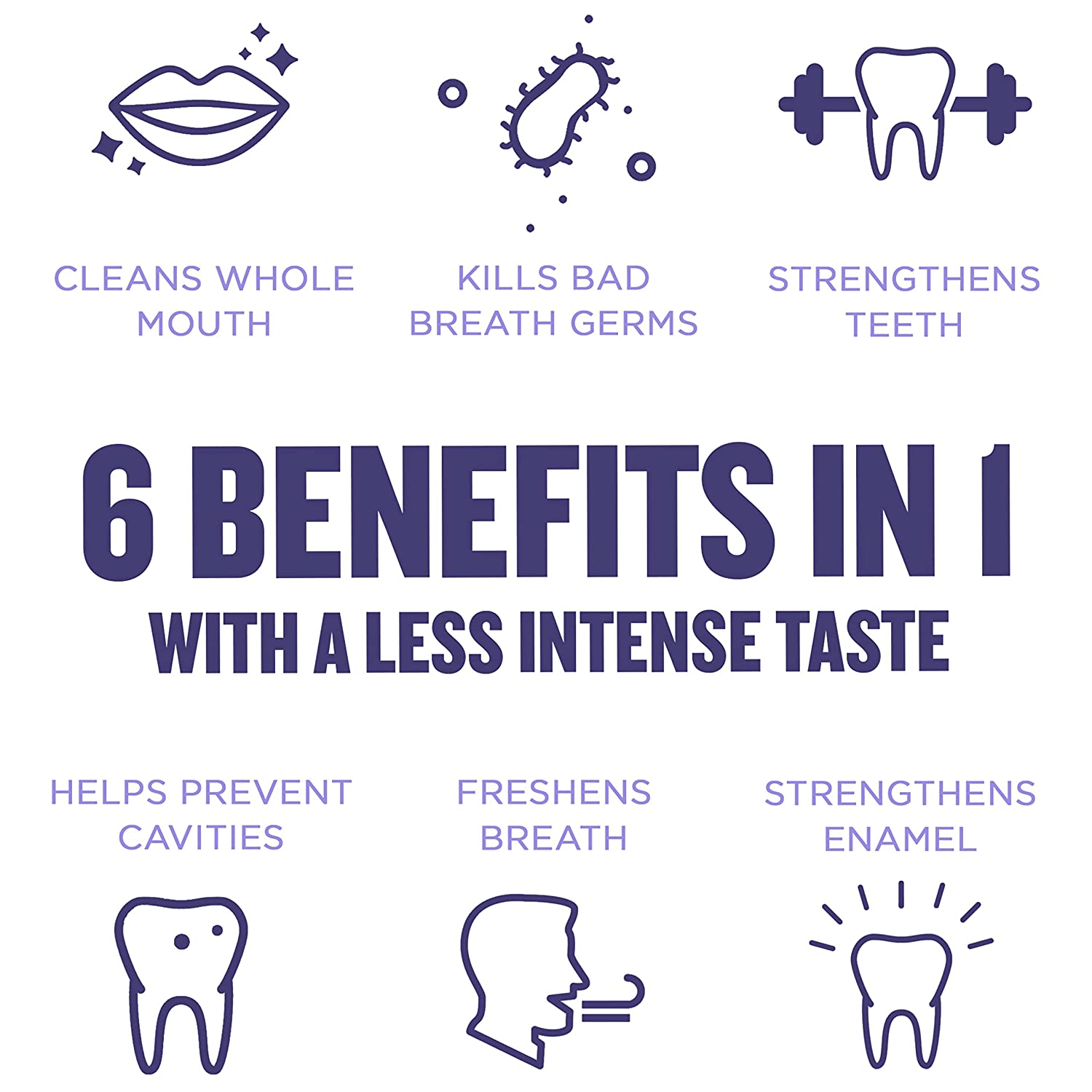 Give your mouth complete oral care with Listerine Total Care Zero Alcohol-Free Fluoride Anticavity mouthwash. Listerine Total Care Zero provides the same six dental hygiene benefits in one as Listerine Total Care Fluoride Anticavity Mouthwash, but in a less intense, alcohol-free mouthwash formula. With up to 2.4x the fluoride uptake than Act mouthwash brand**, this daily fluoride oral rinse formula helps prevent dental cavities by providing 50% greater strengthening of weakened enamel vs. brushing alone*. It freshens breath, kills 99% of germs that cause bad breath, cleans your whole mouth. From the #1 dentist-recommended brand of over the counter mouthwashes, this mouthwash for bad breath in Fresh Mint flavor gives your mouth a clean feeling you can taste, all with a zero alcohol formula. *In laboratory studies **In laboratory tests compared to Act Anticavity Fluoride Mouthwash, Act Total Care Anticavity Fluoride Mouthwash.