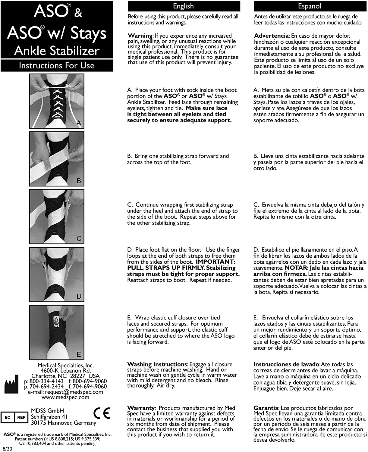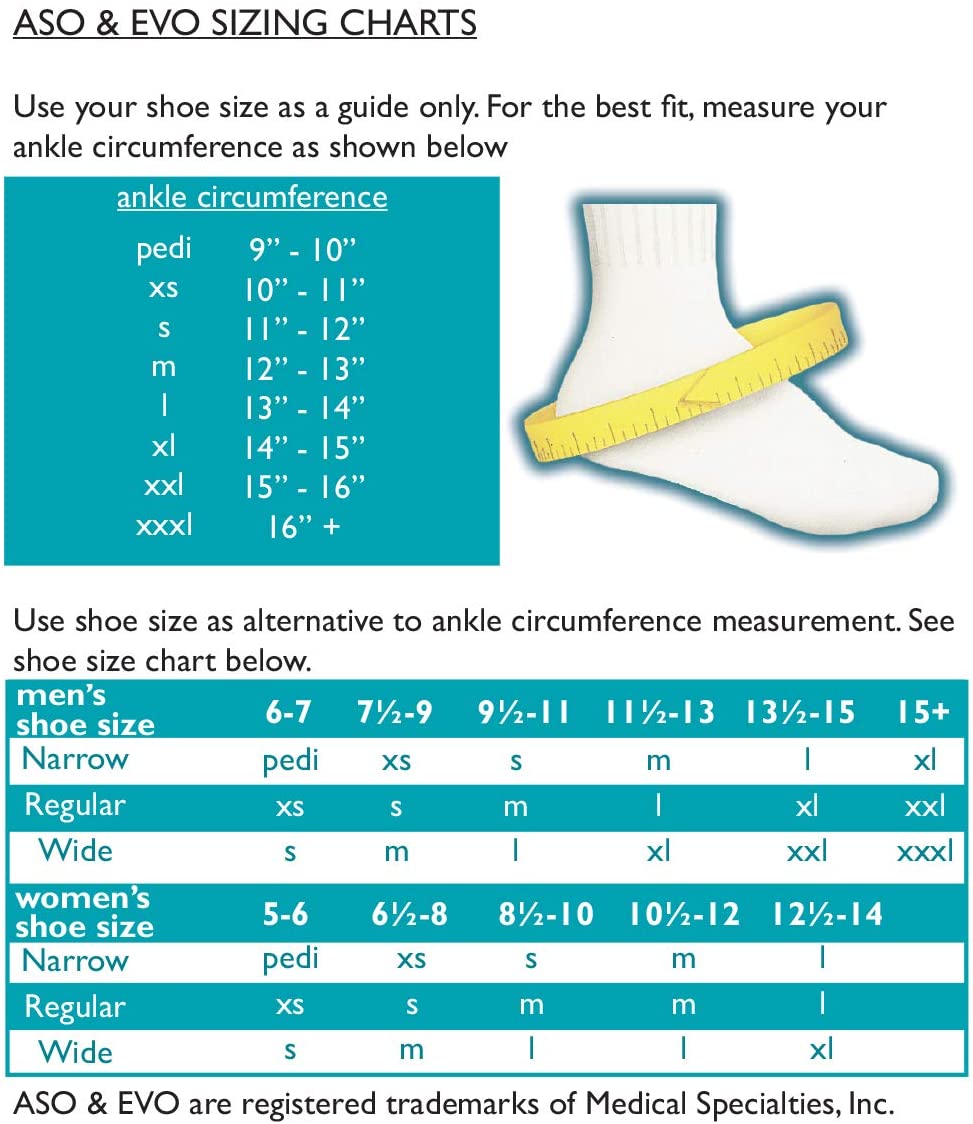 The ASO Ankle Stabilizer is the ankle brace of choice for numerous professional and collegiate athletes. The ASO is also one of the most recommended ankle supports by athletic trainers, orthopedic surgeons and physical therapists. The ASO is one of the leading ankle braces on the market due to its unique combination of comfort, support and durability. The contoured tongue provides exceptional fit and is constructed of light-weight yet durable CoolFlex material. This material also lines the inside back of the boot, providing increased comfort to the Achilles area. The boot has an invisible seam to provide superior comfort. The shoe lace is attached to the tongue to ensure that the lace is always centered. Finger loops at the end of the stabilizing straps assist in securing straps for optimum support. The ASO is manufactured to high quality standards in the United States of America by Medical Specialties, Inc. This product is for single patient use only