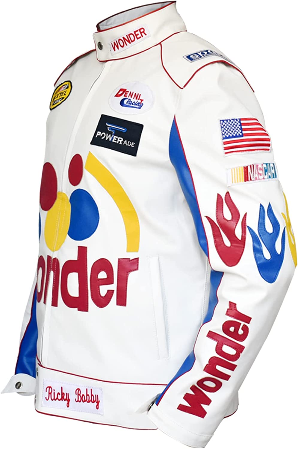 Mens Ricky Bobby Racing White Faux Leather Motorcycle Wonder Jacket, XXS-5XL