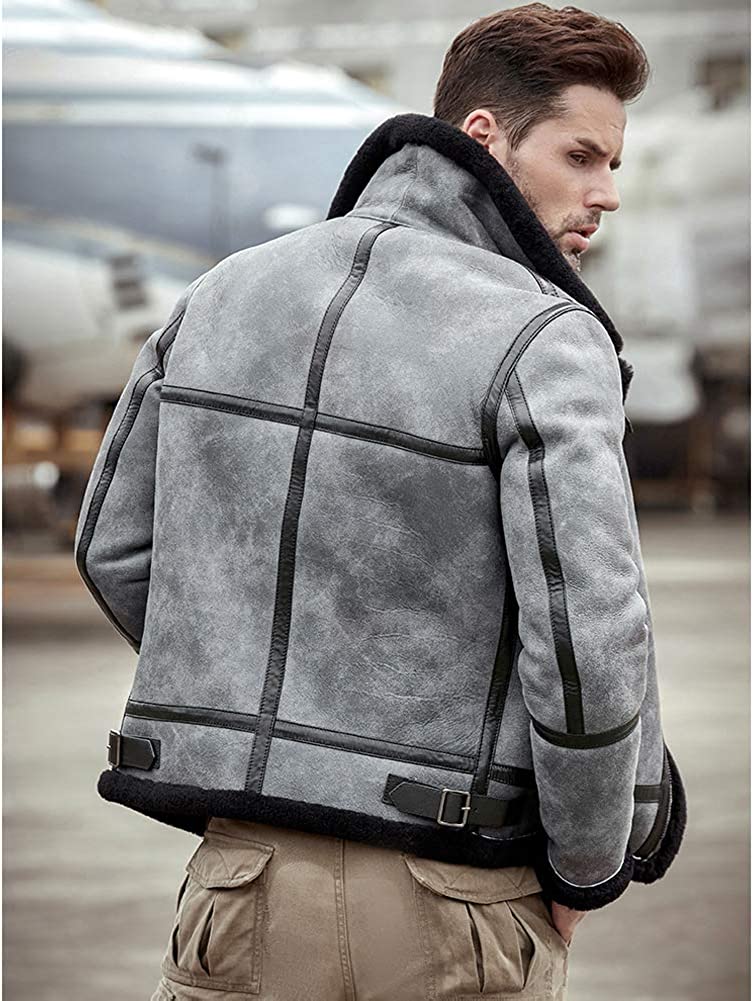 Mens Sheepskin Shearling Jacket B3 Flight Jacket Aviator Winter Coat Fur Bomber Leather Jacket Brown