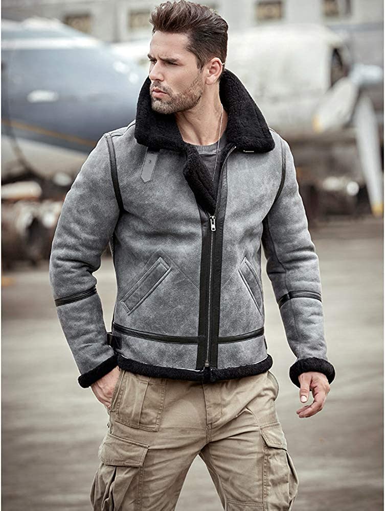 Mens Sheepskin Shearling Jacket B3 Flight Jacket Aviator Winter Coat Fur Bomber Leather Jacket Brown