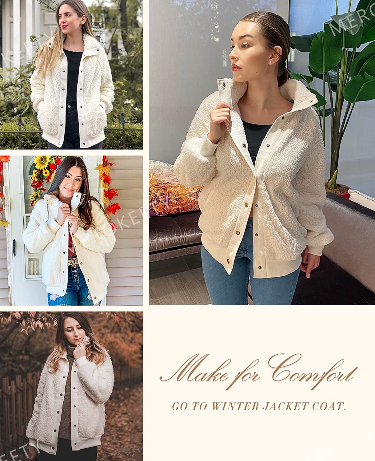 MEROKEETY Womens Winter Long Sleeve Button Sherpa Jacket Coat Pockets Warm Fleece