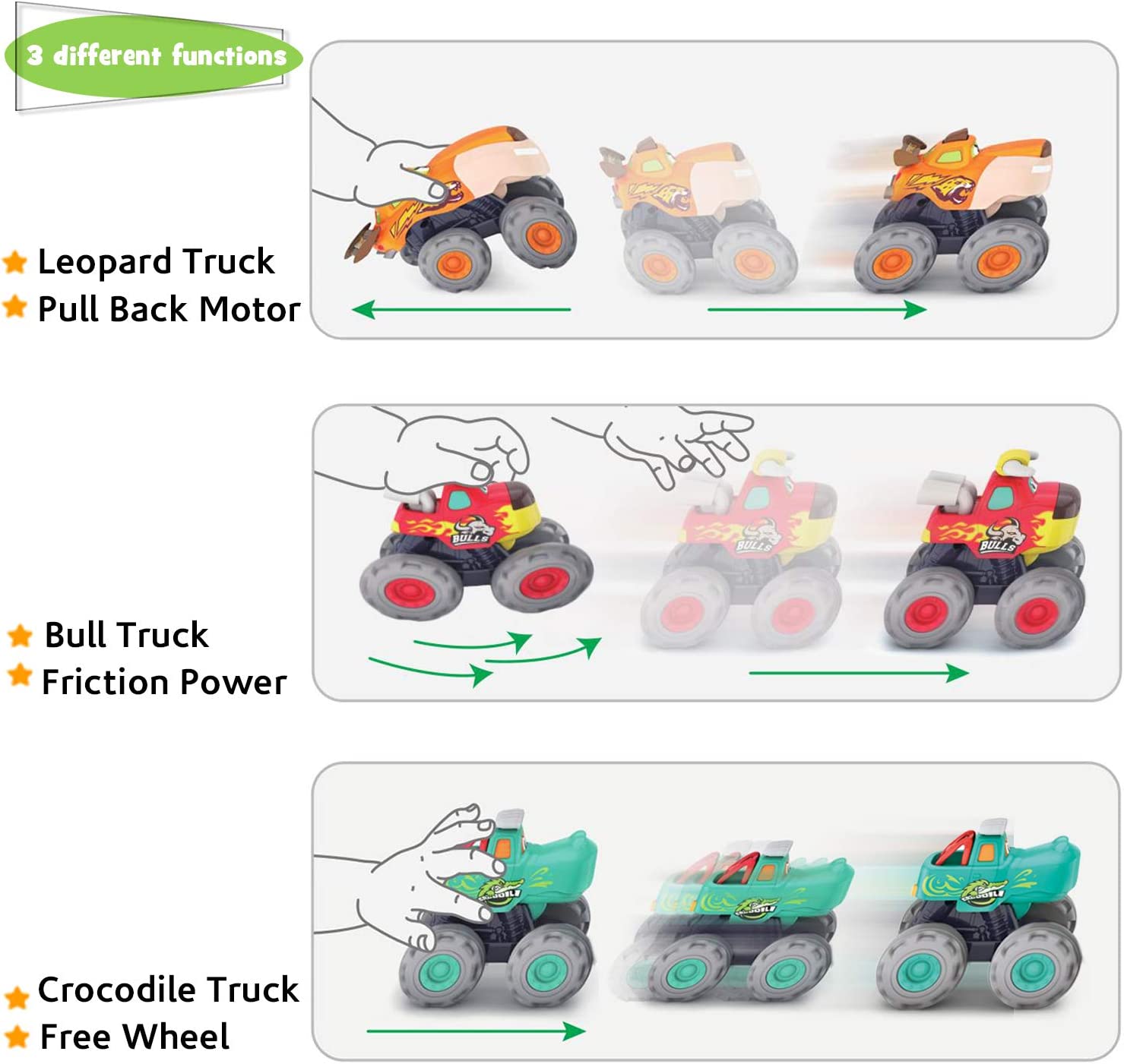 MOONTOY Toy Cars for 1 2 3 Year Old Boys, 3 Pack Friction Powered Cars Pull Back Toy Cars Set - Bull Truck, Leopard Truck, Crocodile Trucks, Push and Go Toy Cars for Toddler Boys Baby Gift.