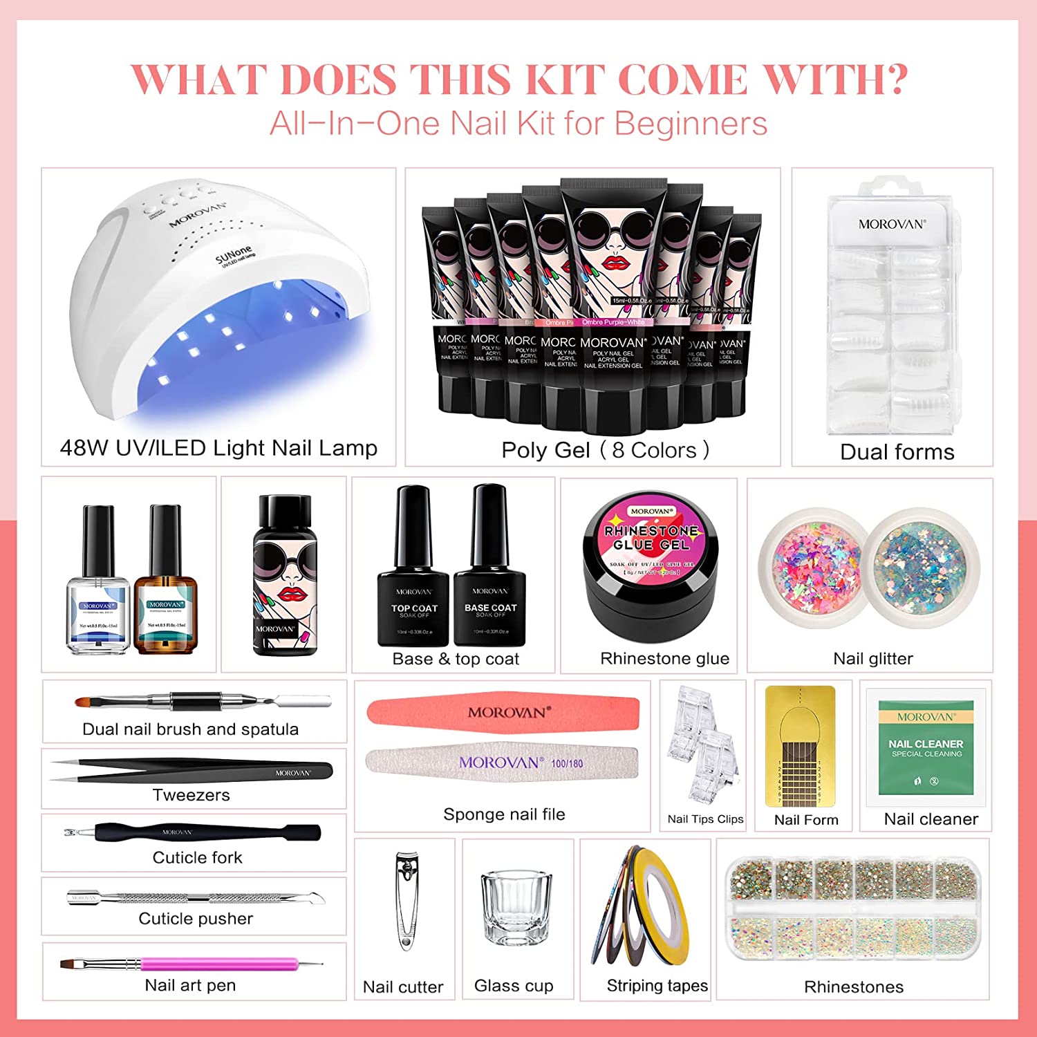 Morovan Poly Gel Nail Kit for Nails with 48W LED Nail Lamp Nail Extension Gel 8 Pcs 0.5oz with Other Basic Poly Gel Nail Art Tools Poly Nail Gel Kit Nail Art Supplies