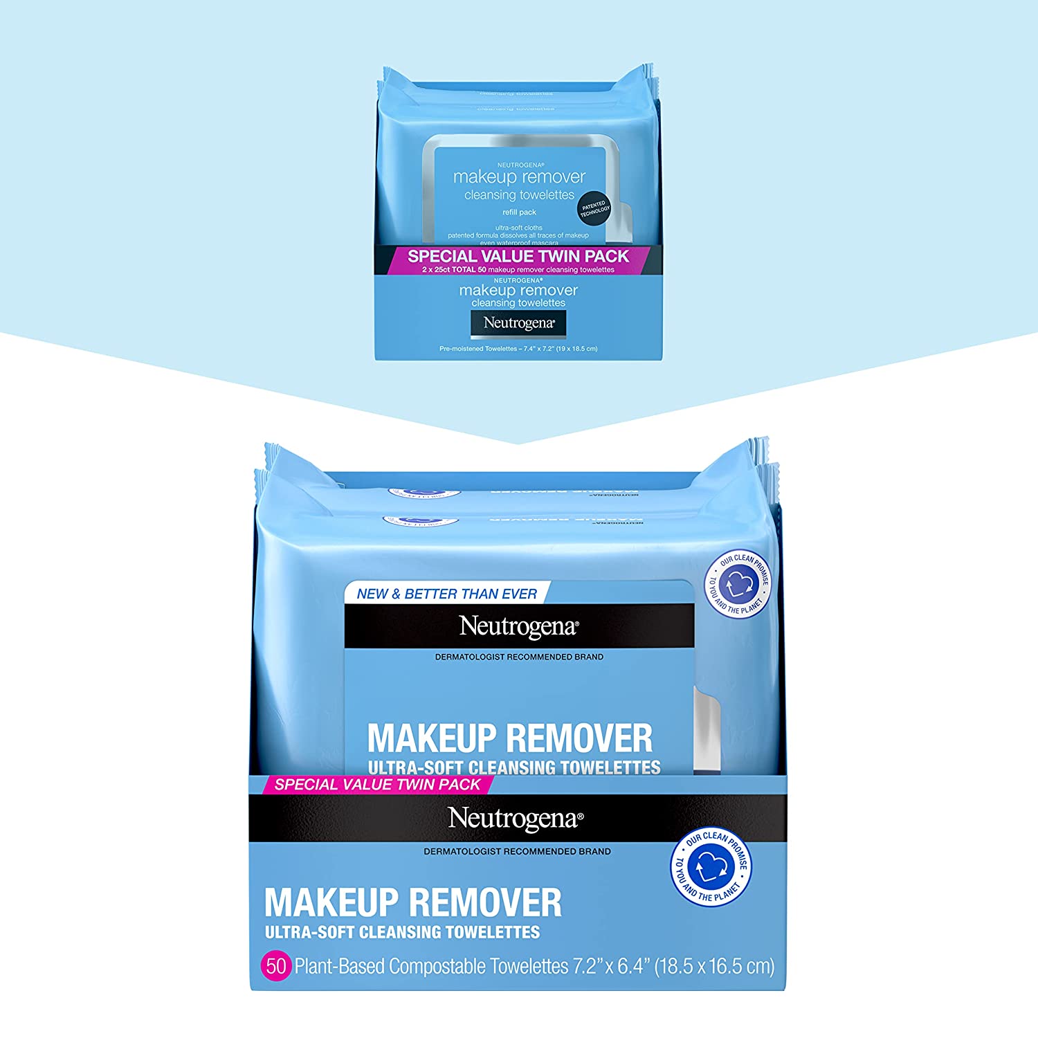Neutrogena Makeup Remover Cleansing Face Wipes, Daily Cleansing Facial Towelettes to Remove Waterproof Makeup and Mascara, Alcohol-Free, Value Twin Pack, 25 Count, 2 Pack