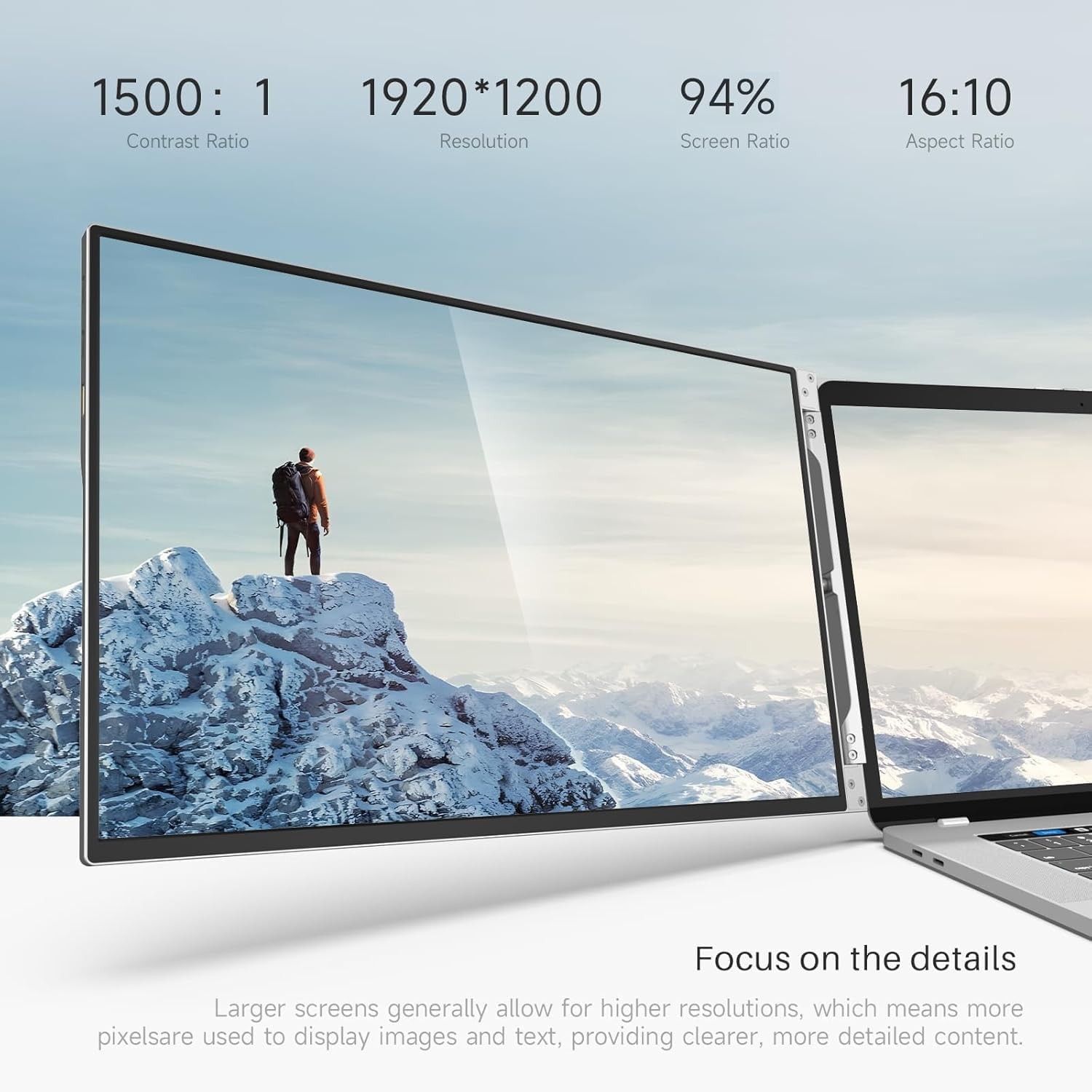 【? Excellent Image Quality】This laptop monitor extender features 16.7 million display colors, 100% sRGB coverage, and Delta E<2 professional color accuracy, ensuring every frame achieves art-grade reproduction quality. The 1500:1 ultra-high contrast ratio reveals eagle-eye sharp shadow details, while 400 nits brightness ensures crystal-clear visibility even under strong ambient light. It is like a clear window to the digital world, bringing every image to life with breathtaking realism.