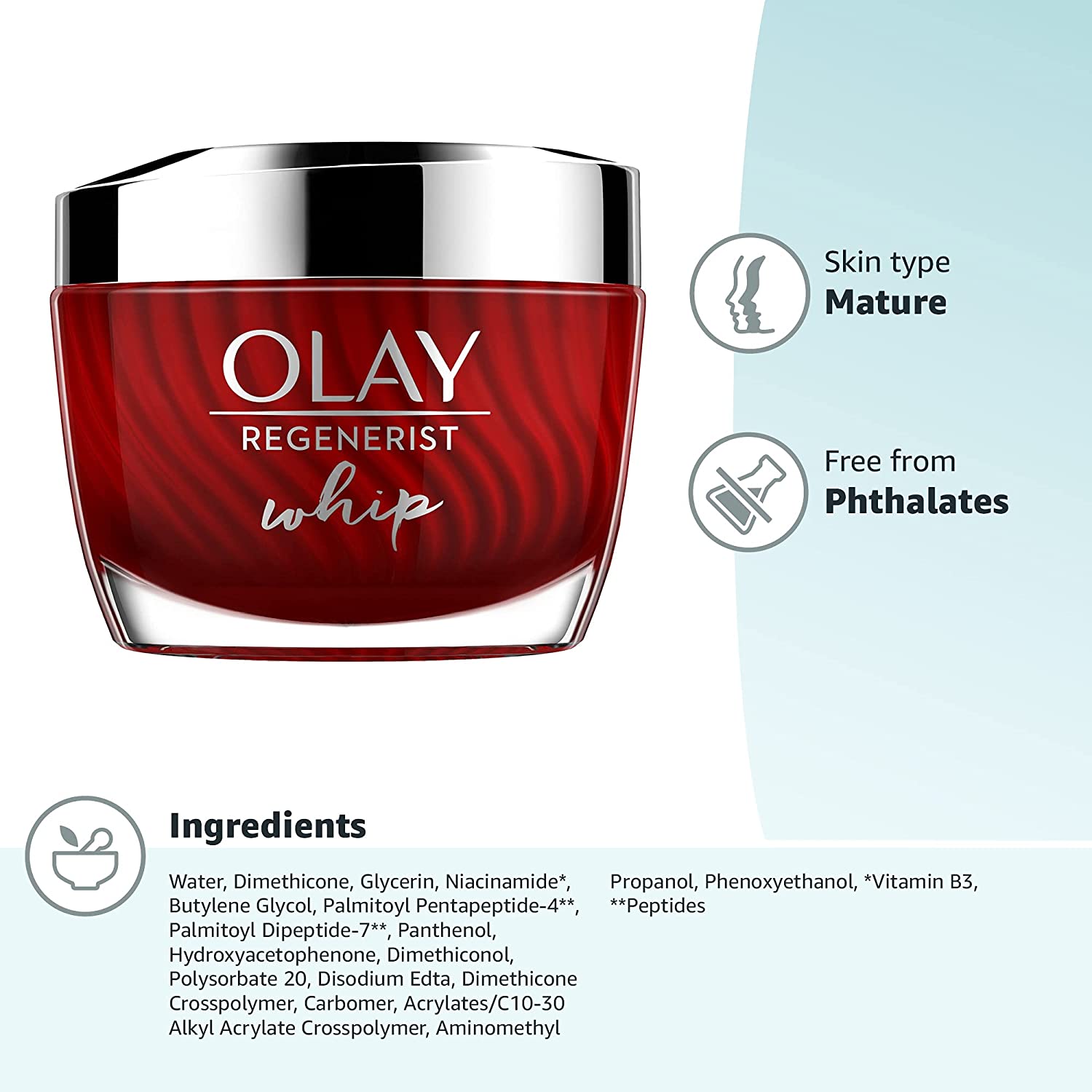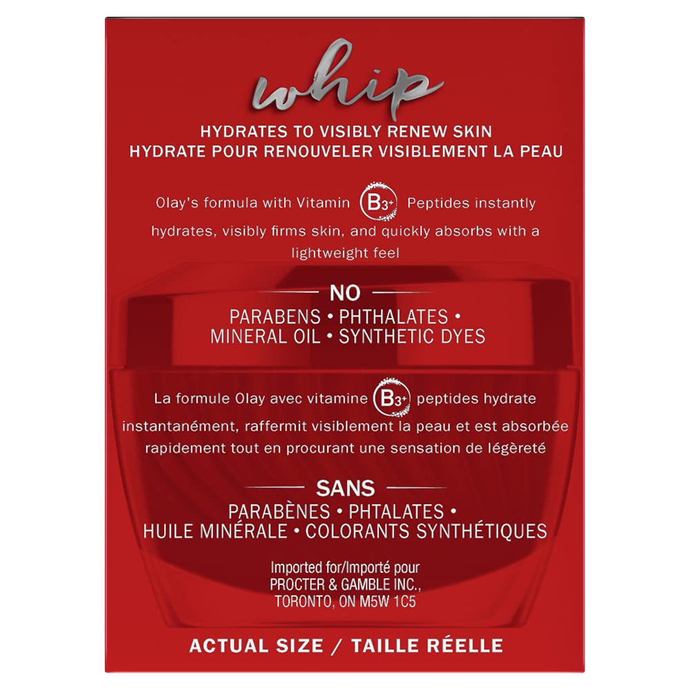 Olay Regenerist Whip delivers powerful wrinkle results without heaviness. This breakthrough facial moisturizer transforms from cream to liquid on contact for fast absorption and a breathable feel. You’ll see skin that’s smooth, matte and shine-free. Formulated with advanced Amino-Peptide Complex II, this anti-aging moisturizer actively hydrates to improve elasticity and firm skin for a lifted look, while diminishing the look of fine lines and wrinkles. Its innovative Active Rush Technology features a unique three-dimensional structure that transforms from cream to liquid on skin to deliver potent ingredients in an ultra-lightweight form. Forget about that sticky or greasy feeling, have it all with Regenerist Whip for powerful skincare with a light as air finish. Paraben-free.