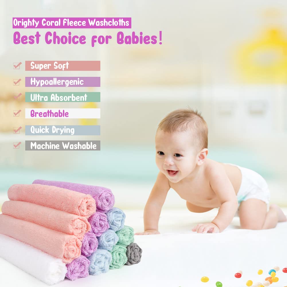 Orighty Baby Washcloths 24-Pack, Microfiber Coral Fleece Baby Face Towels, Soft and Absorbent Wash Cloths for Newborns, Infants and Toddlers, Gentle on Delicate Skin for Face Hands and Body, 7x9 Inch
