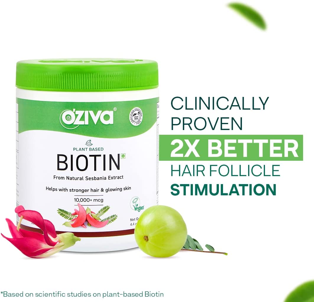 OZiva Plant Based Biotin for Hair Growth| Biotin Powder for Hair Follicle Stimulation & Healthier Texture, Skin, Nails & Body (with Silica, Sesbania Agati), Certified Clean & Vegan, 125g