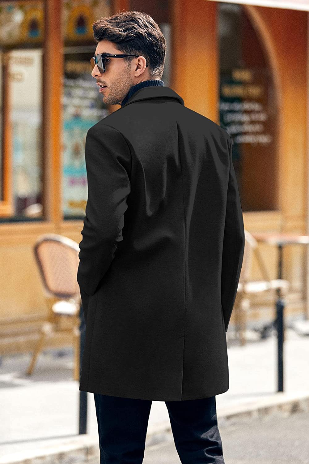 PASLTER Mens Trench Coat Slim Fit Notched Collar Fall Winter Single Breasted Pea Coat Warm Soft Overcoat