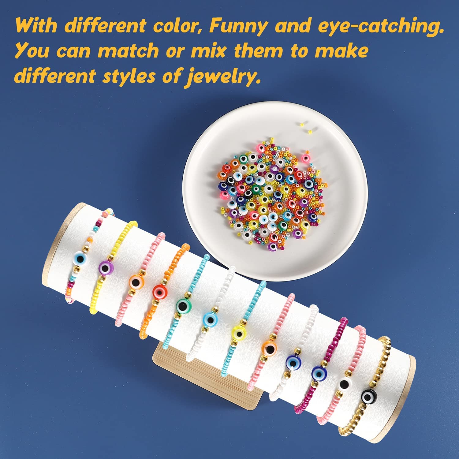 PHUNTTEK 2400pcs Seed Beads and Evil Eye Beads for Jewelry Making, 3mm Glass Seed Beads 8mm Flat Evil Eye Easter Beads Decors Colorful Bracelet Beads Kit for Bracelets Making DIY Beading Supplies