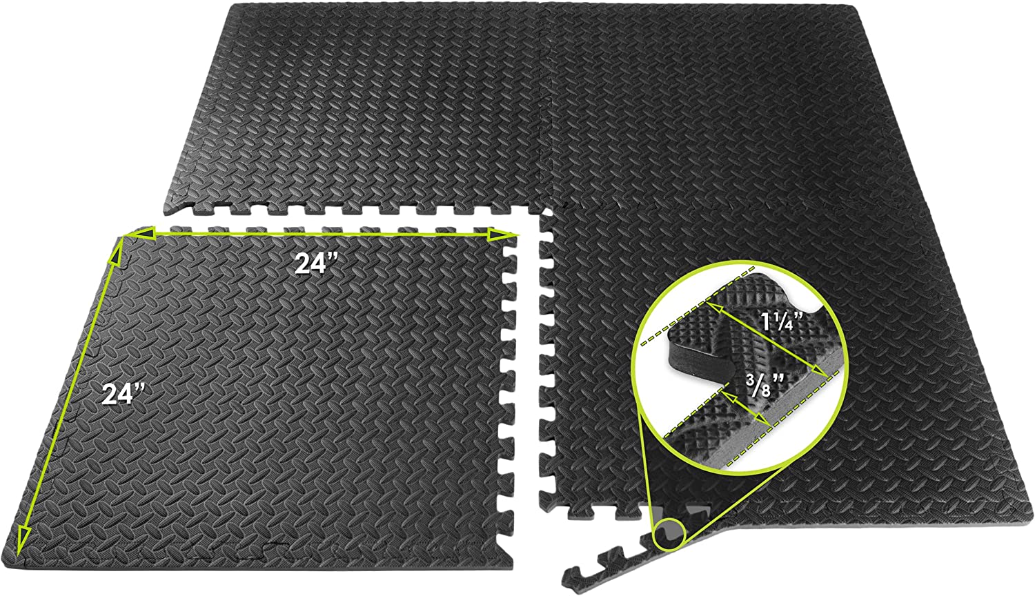 Each tile is ½” thick from the highest point of the texture. The interlocking foam mats are made from dense EVA foam which absorbs impact and noise during workouts and provides a soft surface for exercises like push-ups and crunches. Easy-to-assemble interlocking foam floor pads covers 24, 48 or 144 square feet with end borders for a clean, finished look. Soft foam puzzle mat contains no phthalates.