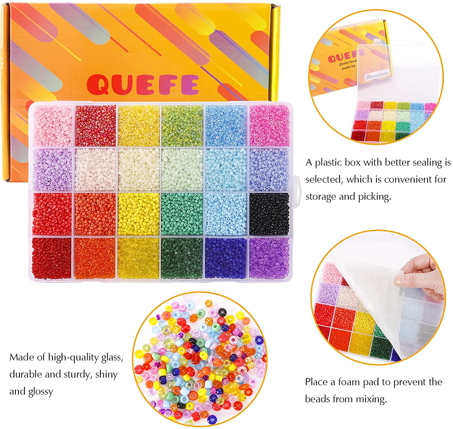 Quefe 26400pcs 2mm Glass Seed Beads 24 Colors Small Beads Kit Bracelet Beads with 24-Grid Plastic Storage Box for Jewelry Making