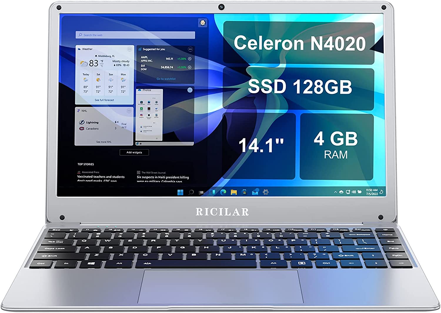 RICILAR Windows 10 Home Laptop, 14.1 Inch HD Display, Intel Celeron N4020, 4GB RAM, 128GB SSD, Backlit Keyboard, Type C, HDMI, Wi-Fi 5, Silver, School Laptop Computer for Students and Business