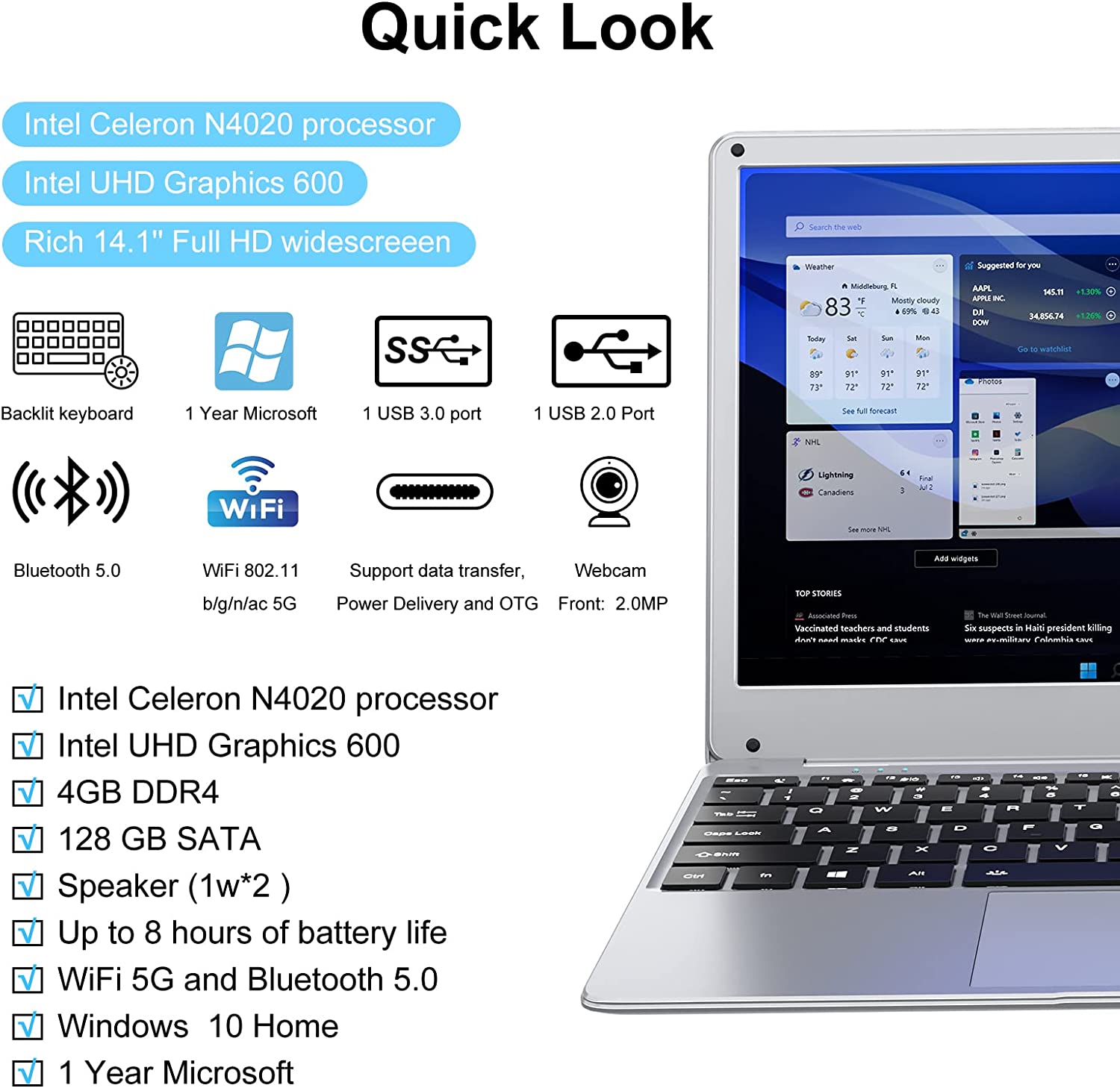 RICILAR Windows 10 Home Laptop, 14.1 Inch HD Display, Intel Celeron N4020, 4GB RAM, 128GB SSD, Backlit Keyboard, Type C, HDMI, Wi-Fi 5, Silver, School Laptop Computer for Students and Business