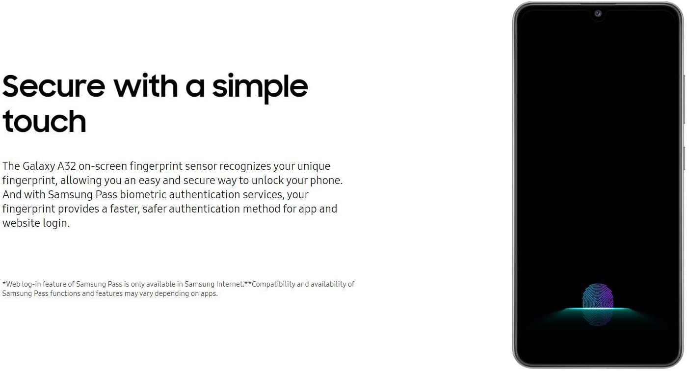 Awesome screen, real smooth scrolling: Feast your eyes on vibrant details with the FHD+ Super AMOLED display, reaching 800 nits for clarity even in bright daylight. Eye Comfort Shield lowers blue light, and 90Hz keeps the view smooth, whether you're gaming or scrolling. All on the expansive 16.21cm (6.4") Infinity-U Display. Awesome Camera, capture every detail: Galaxy A32's multi-lens camera system takes photos to the next level. Go ultra high-res on the 64MP Main Camera for crisp, clear photos throughout the day. Expand the viewing angle with Ultra Wide Camera. Customize focus with Depth Camera, or get closer to the details with Macro Camera. Awesome battery, lasts two days: The 5,000mAh (typical) battery gives you more time to do what you love—streaming, sharing, gaming and more. AI power management detects and adjusts to your mobile usage habits for long-lasting power. And with up to 15W of Adaptive Fast Charging, Galaxy A32 gets back to full power, quickly. Awesome performance to do more at once: Whether you're focused on one task or multiple tasks at once, Galaxy A32 delivers a big boost in performance thanks to an advanced Octa-core processor and up to 4GB of RAM. Store more and delete less with 128GB internal storage. If that's not enough, add up to 1TB with microSD card.