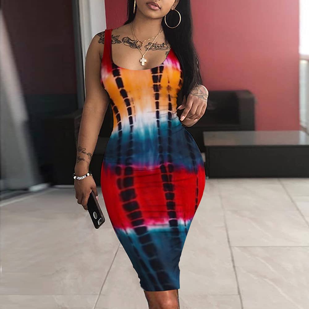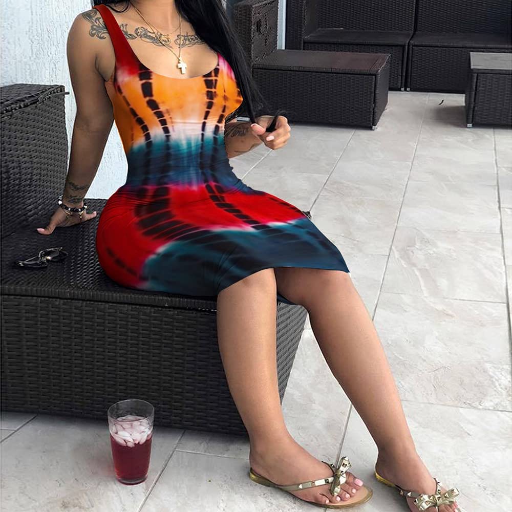 Sexy Summer Women's Casual Tie-dye Round Neck Sleeveless Club Beach Basic Bodycon Midi Tank Dress Sun Dresses
