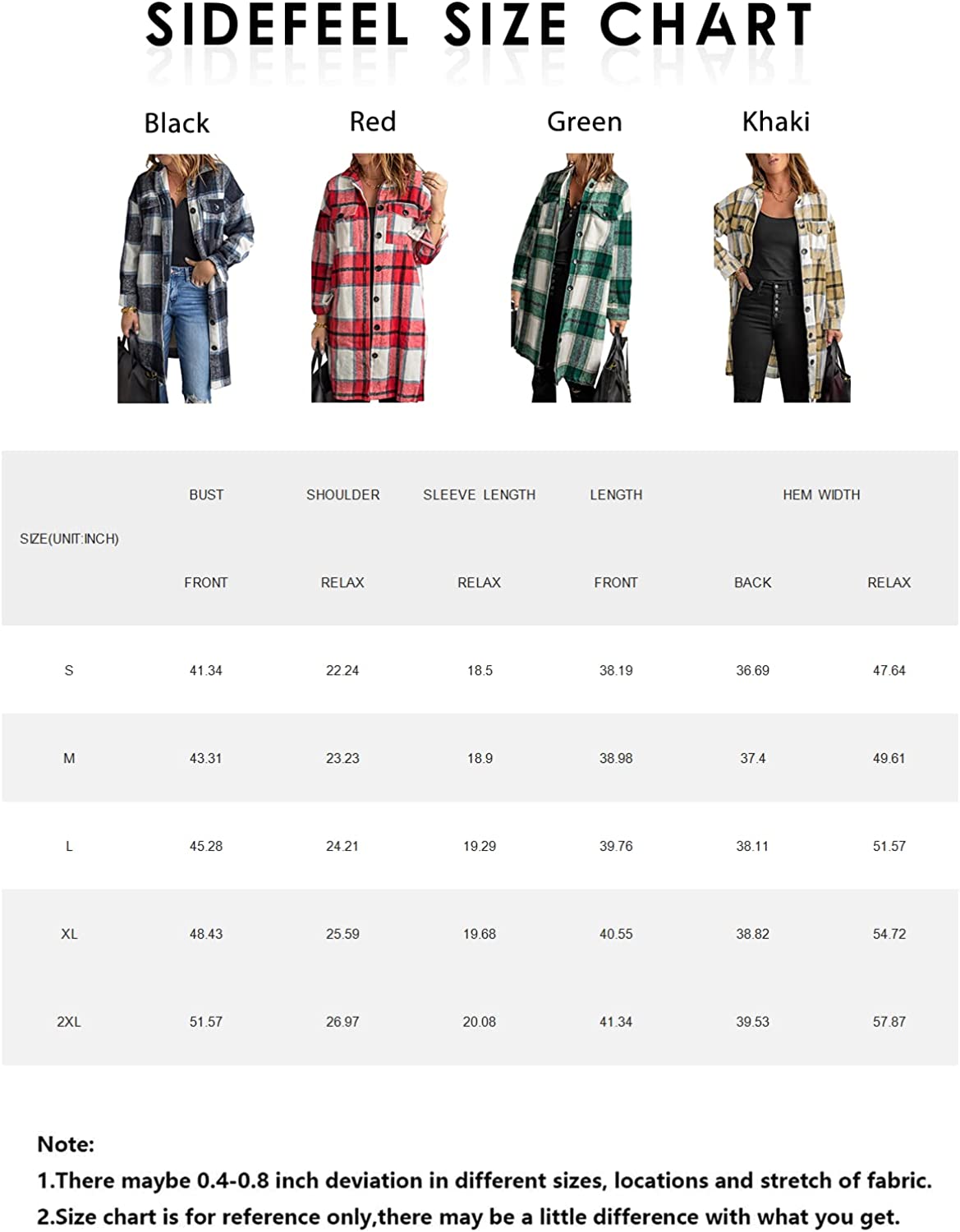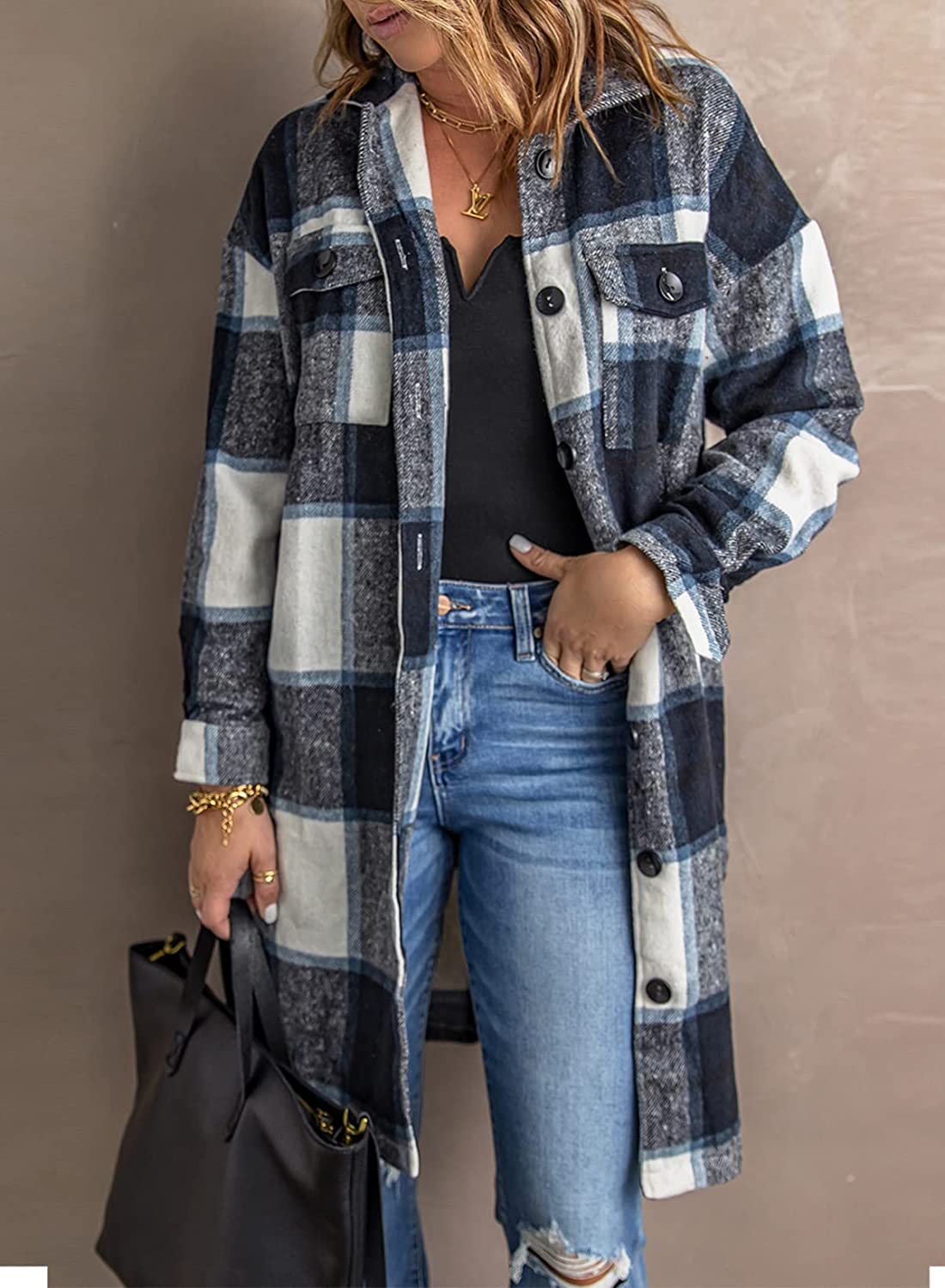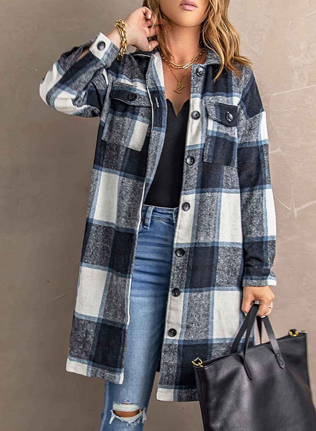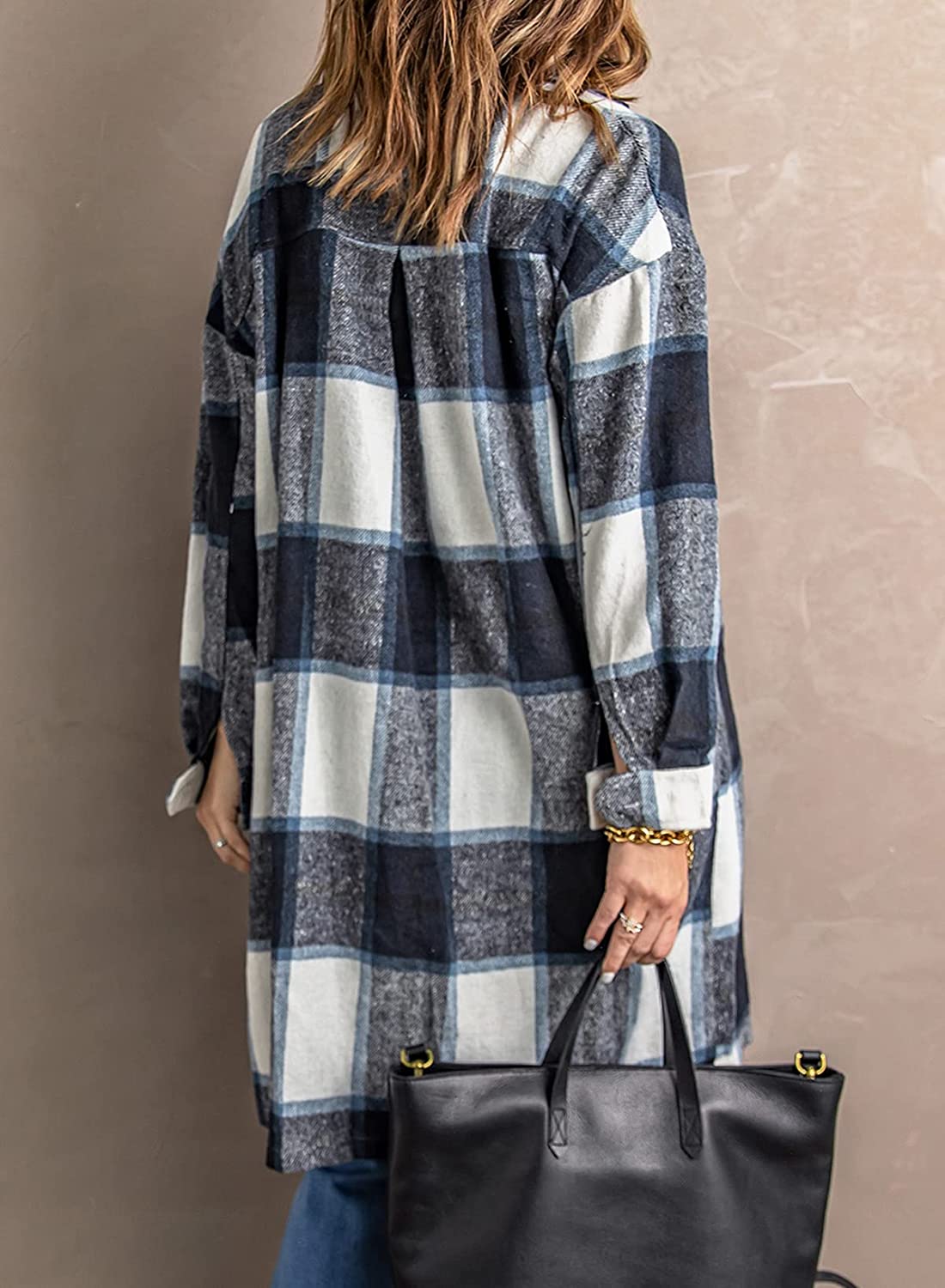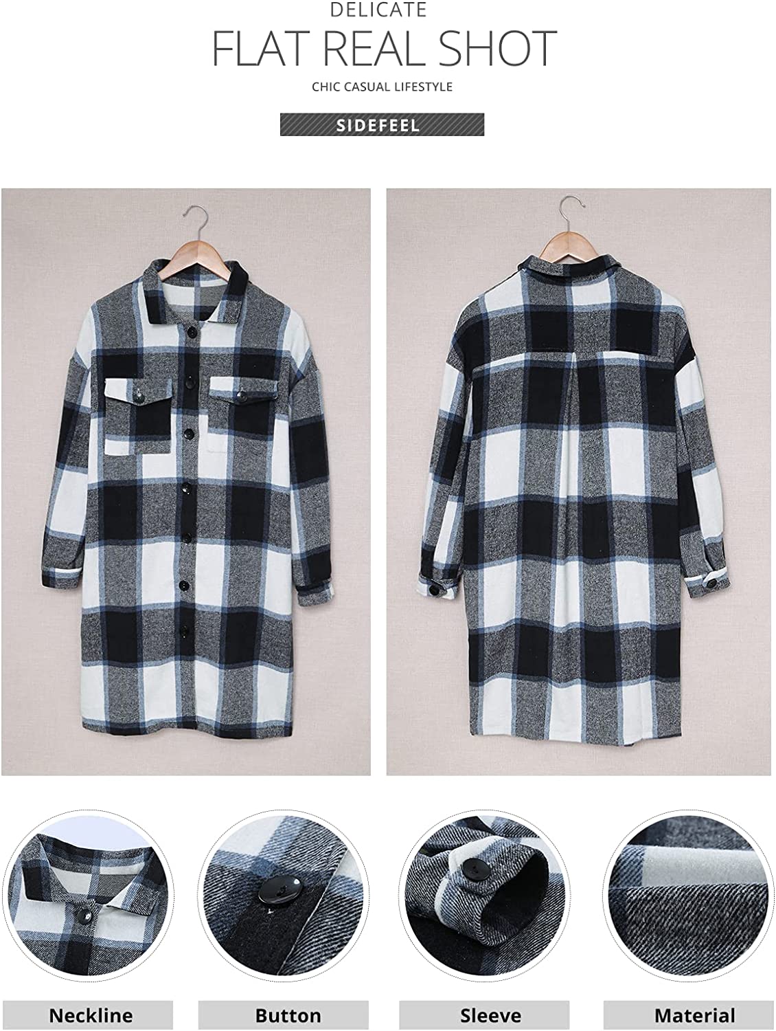 Sidefeel Women Plaid Long Sleeve Button Down Collar Long Shirt Oversized Coat