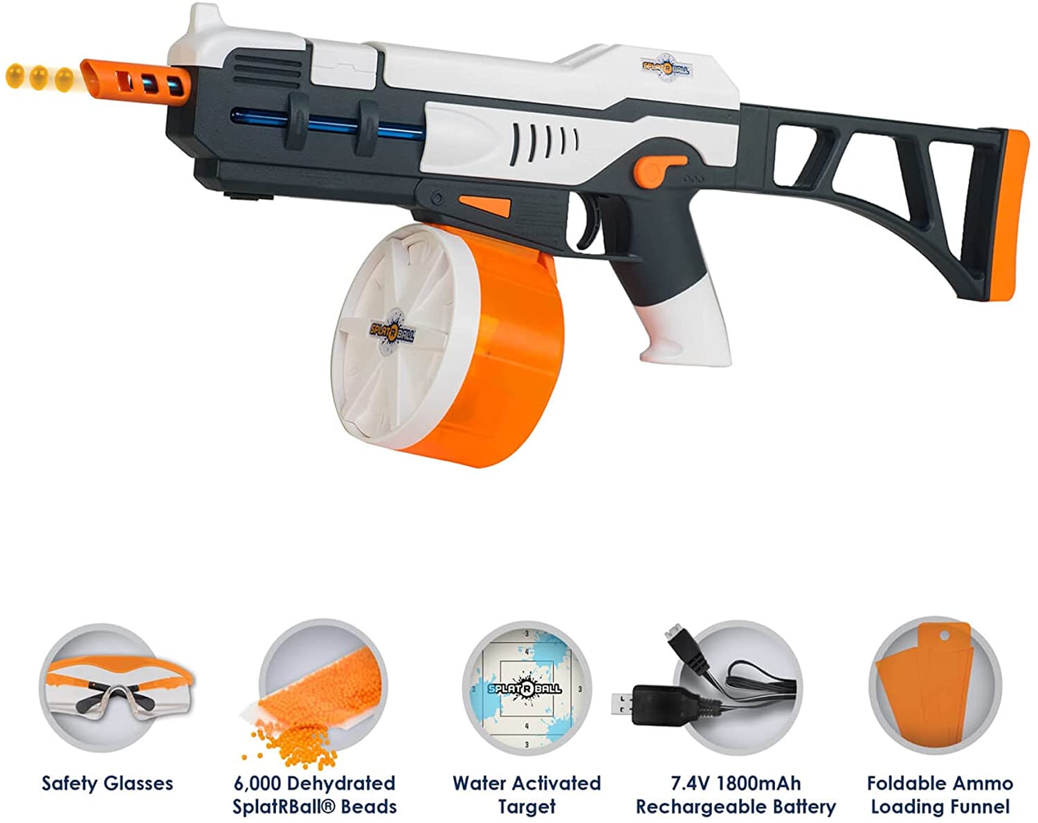 SPLATRBALL everything in your path with full auto water bead fire rate and a 1,200 round drum magazine! The SPLATRBALL SRB1200 Full Auto Water Bead Blaster shoots up to 210 feet per second (fps) SPLATRBALL ammo. It has a drum magazine with 1,200 round capacity. Shoots Certified 7.5mm SPLATRBALL water bead ammo at fire rate. This kit contains one Blaster, 1,200 round drum magazine, detachable stock, 6,000 rounds of SPLATRBALL water beads, rechargeable 7.4V 1800mAh battery with charging cable (up to 5,000 shots per battery charge), SPLATRBALL collapsible funnel for magazine quick loading, safety glasses and one water activated target.