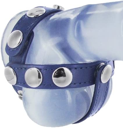 Keep your penis standing at attention with our classic Strict Leather Cock and Ball Harness, now in blue. This harness is fully adjustable to fit most men. This harness has a 3 snap strap that goes around the cock and balls, another strap that fits securely under the penis, and a third strap that divides the testicles for a nice constant tugging sensation. Measurements: Strap circling both penis and testicles adjusts from 6.38 to 7.75 inches in circumference. Material: Leather, Metal. Color: Blue. Note: Dildo pictured not included.
