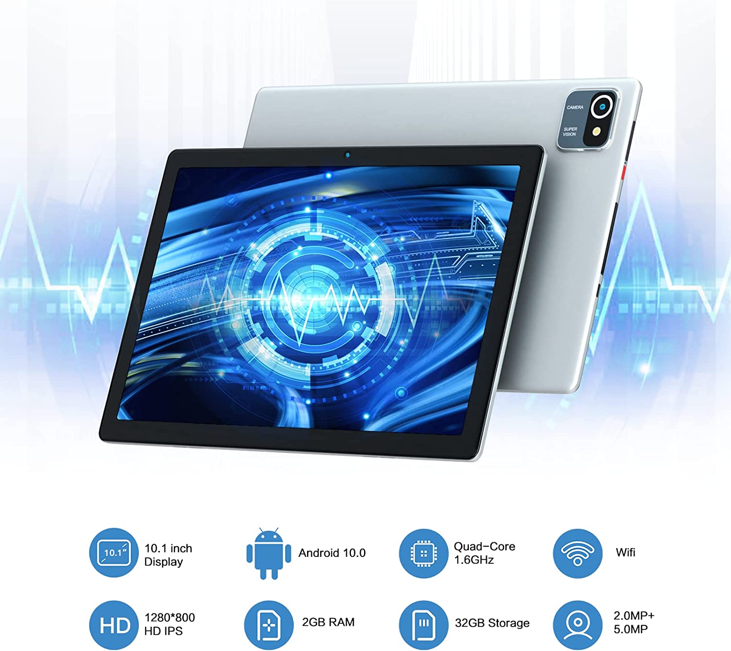 Tablet 10.1 Inch Android 10-2GB RAM 32GB ROM, 6000mAh Battery Quad Core IPS HD Touchscreen Tablets (Silver)
