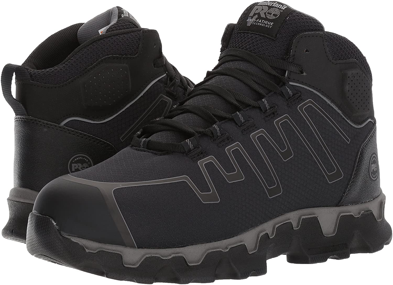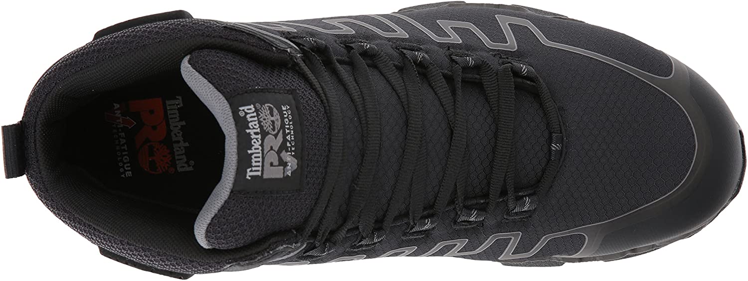 Men's Timberland Pro, Powertrain Sport Mid Alloy EH Work Boot. These work boots will provide the ultimate in protection and comfort. Perfect for industrial or warehouse work. Metal free upper design with manmade and fabric featuring an alloy safety toe for lightweight protection Lace up closure for a secure fit with a padded tongue and collar for added support Fabric lining with antimicrobial treatment for odor control with a cushioned footbed for added comfort Anti-fatigue technology built in the outsole helps absorb shock and returned energy to key ones of the foot Electrical safe design with Timberland Pro 24/7 comfort suspension for ultimate comfort Slip, oil- and abrasion-resistant with static dissipative and non-marking rubber outsole. Heel Height of 1.50 inches