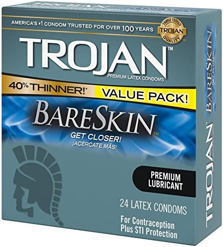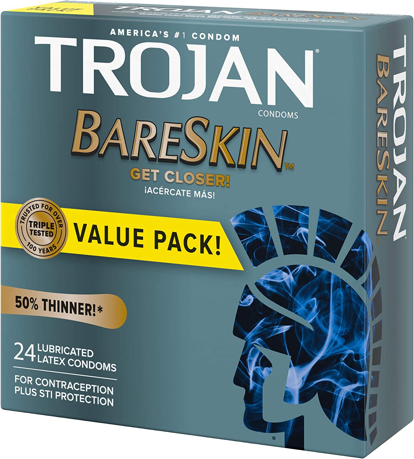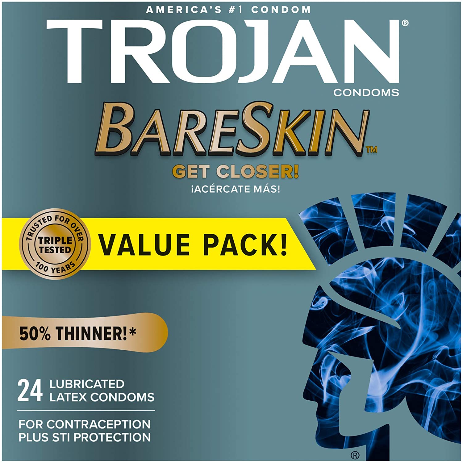 TROJAN BARESKIN Condoms are the thinnest latex condoms TROJAN brand makes. They're 50% thinner than our standard latex condom, so they feel more natural and give you more sensitivity. So, you can get closer and experience enhanced intimacy, whenever the mood hits. Plus, our premium silky smooth lubricant adds comfort so that you and your partner get a night to remember every time. They’re made from a premium quality latex and are electronically tested to help ensure reliability. These condoms reduce the risk of unintended pregnancy and sexually transmitted infections (STIs) while you play. For extra safety, there is a special reservoir end. Includes one box of 24 TROJAN BARESKIN Condoms. TROJAN Brand condoms are America's #1 condom, trusted for over 100 years. The TROJAN Brand promotes a safe, healthy, and fun sex life. From condoms to vibrators to lubricants, TROJAN Brand is dedicated to delivering innovative, high-quality products that offer pleasure and protection.