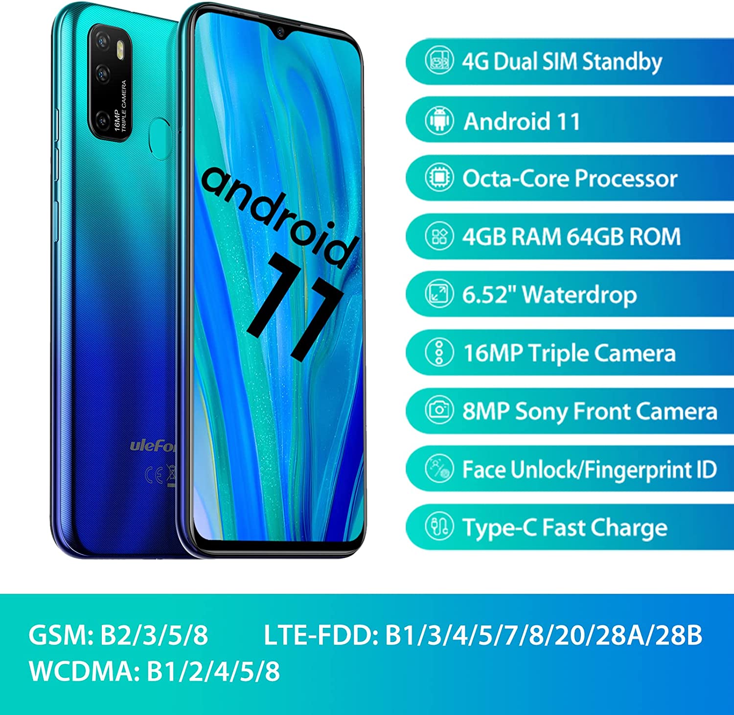 Unlocked Smartphones Ulefone Note 9P, 16MP + 5MP + 2MP, Dual Sim Phones Unlocked, Android 11 4GB+64GB ROM, 6.52" FHD, Fingerprint Face Detection, 4500mAh high Capacity Battery, T-Mobile - Blue