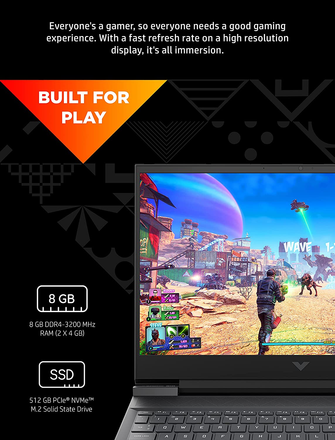 It’s playtime for gamers everywhere with the Victus by HP 16.1 inch Gaming Laptop PC. Play with power as award-winning hardware such as the NVIDIA® GeForce RTX™ 3050 architecture (with 4 GB of dedicated memory) dials the graphics up a notch (2). Game on the go, even outside in direct sunlight, thanks to the 1080p micro-edge display with an anti-glare panel (3). Enjoy elite levels of gaming performance with the AMD Ryzen™ 5 5600H Mobile Processor, boasting up to 4.2 GHz max boost clock (4) (5). Experience increased responsiveness and improved frame rates with 8 GB of RAM, as well as shorter load times and faster boot-ups as 512 GB SSD of storage is perfect for file heavy, modern gaming titles (6) (7). All of your laptop computer’s advanced hardware is cooled and stabilized with an enhanced thermal solution, upgraded specifically for this AMD gaming laptop (1). Game on as additional software and hardware features enable all-day play sessions. No need to put this laptop for gaming down with 10 hours and 30 minutes of battery life (8). What’s more, even if you do run out of power, HP Fast Charge gets you back in the game fast with 50% charge in just 30 minutes (9). Even on a futuristic device such as this, your Windows 10 laptop feels familiar with an operating system you understand and enjoy (10). Compute with confidence courtesy of a 1-year hardware warranty. Stay connected, even while out of the house with the powerful Wi-Fi 6 (2x2) and Bluetooth® 5.2 combo, offering ultra-fast gigabit data rate (11) (12). Elevate your play in the OMEN Gaming Hub. Everything gaming is now in your control, from earning play-based gaming rewards to fine tuning every performance and lighting nuance for a truly personalized gaming experience. Built with the environment in mind, your Windows laptop is designed using sustainable materials like ocean-bound plastic in the speaker enclosure and post-consumer recycled plastic in the keycaps (13) (14). The outer boxes and fiber cushions used in the packaging are 100% sustainably sourced and recyclable (15). Not only is your device eco-conscious but also energy efficient, being both ENERGY STAR® certified and EPEAT® Silver registered (16) (17). (1) Thermal solution varies by configuration. (2) ©2021 NVIDIA Corporation. NVIDIA, the NVIDIA logo, GeForce, and GeForce RTX have registered trademarks and/or trademarks of NVIDIA Corporation in the United States and other countries. All other trademarks and copyrights are the property of their respective owners. (3) Full High Definition (FHD) content is required to view FHD images. (4) Multi-core is designed to improve the performance of certain software products. Not all customers or software applications will necessarily benefit from the use of this technology. Performance and clock frequency will vary depending on application workload and your hardware and software configurations. AMD’s numbering is not a measurement of clock speed. AMD and Radeon are trademarks of Advanced Micro Devices, Inc. (5) Max Boost clock frequency performance varies depending on hardware, software, and overall system configuration. GHz refers to the internal clock speed of the processor. Other factors besides clock speed may impact system and application performance. (6) Actual formatted capacity is less. A portion of internal storage is reserved for preloaded content. (7) Based on HP internal testing using CrystalDiskMark benchmarking software. Performance is sequentially faster (read-only) compared to traditional 5,400 rpm HDD. (8) Windows 10 MobileMark 18 battery life will vary depending on various factors including product model, configuration, loaded applications, features, use, wireless functionality, and power management settings. The maximum capacity of the battery will naturally decrease with time and usage. See bapco.com/products/mobilemark-2018/ for additional details. (9) Recharges your battery up to 50% within 30 minutes when the system is off (using the “shut down” command). Recommended for use with the HP adapter provided with the notebook, not recommended with a smaller capacity battery charger. After charging has reached 50% capacity, the charging speed will return to normal speed. Charging time may vary +/-10% due to System tolerance. (10) Not all features are available in all editions or versions of Windows. Systems may require upgraded and/or separately purchased hardware, drivers, software, or BIOS update to take full advantage of Windows functionality. Windows 10 is automatically updated, which is always enabled. ISP fees may apply and additional requirements may apply over time for updates. See microsoft.com (11) Wireless access point and internet service required and sold separately. The availability of public wireless access points is limited. Wi-Fi CERTIFIED 6TM (802.11ax) is backwards compatible with prior 802.11 specs. Wi-Fi CERTIFIED 6TM is designed to support gigabit data rate when transferring files between two devices connected to the same router. Requires a wireless router, sold separately, that supports 80MHz and higher channels. Only available in countries where 802.11ax is supported. (12) Bluetooth® is a trademark owned by its proprietor and used by Hewlett-Packard Company under license. (13) Percentage of ocean-bound plastic contained in each component varies by product. (14) Keyboard keycaps contain post-consumer recycled plastic. The percentage contained in each component varies by product. (15) 100% outer box/corrugate cushion packaging made from sustainably sourced certified and recycled fibers. Fiber cushions are made from 100% recycled wood fiber and organic material. Excludes plastic bags and plastic foam sheeting. (16) ENERGY STAR and the ENERGY STAR mark are registered trademarks owned by the U.S. Environmental Protection Agency. (17) Based on U.S. EPEAT® registration according to IEEE 1680.1-2018 EPEAT®. EPEAT® status varies by country. Visit www.epeat.net for more informatio